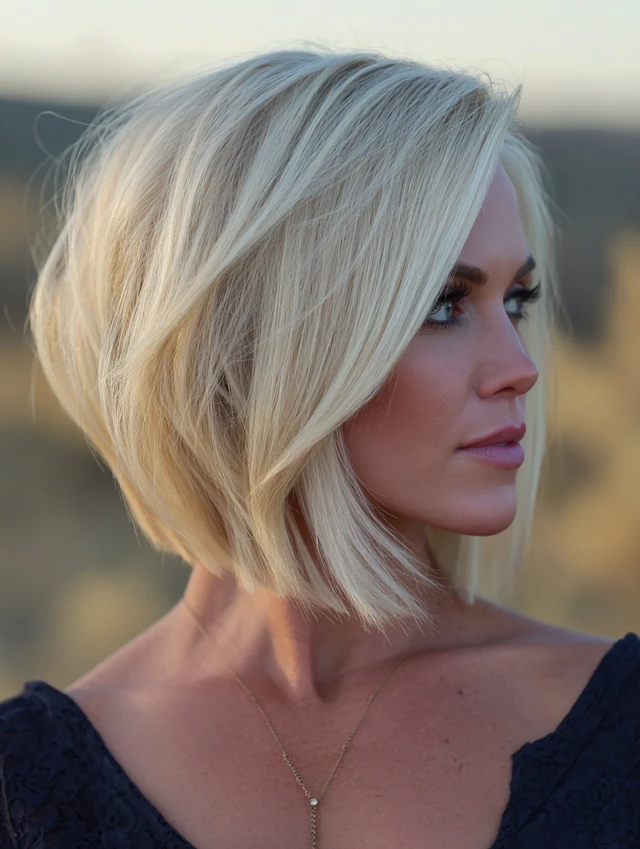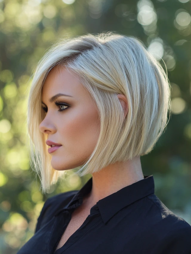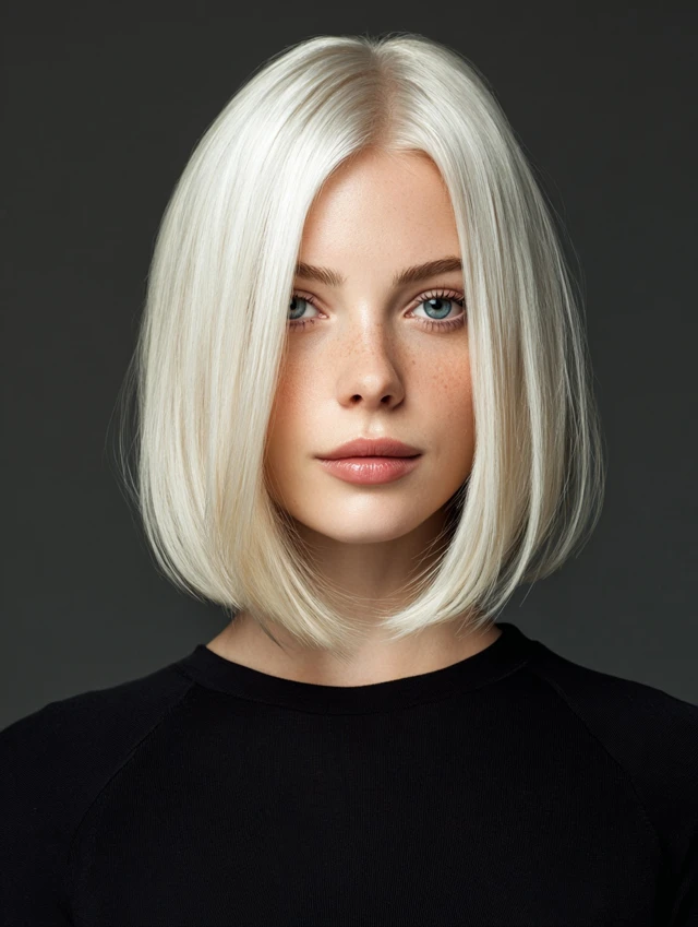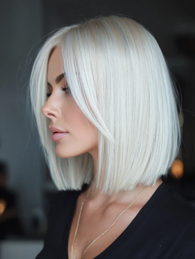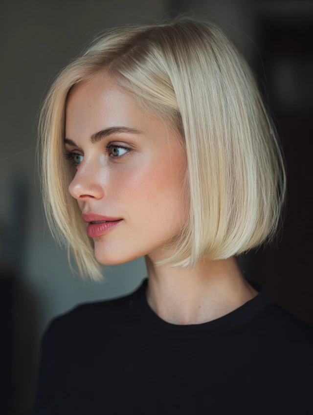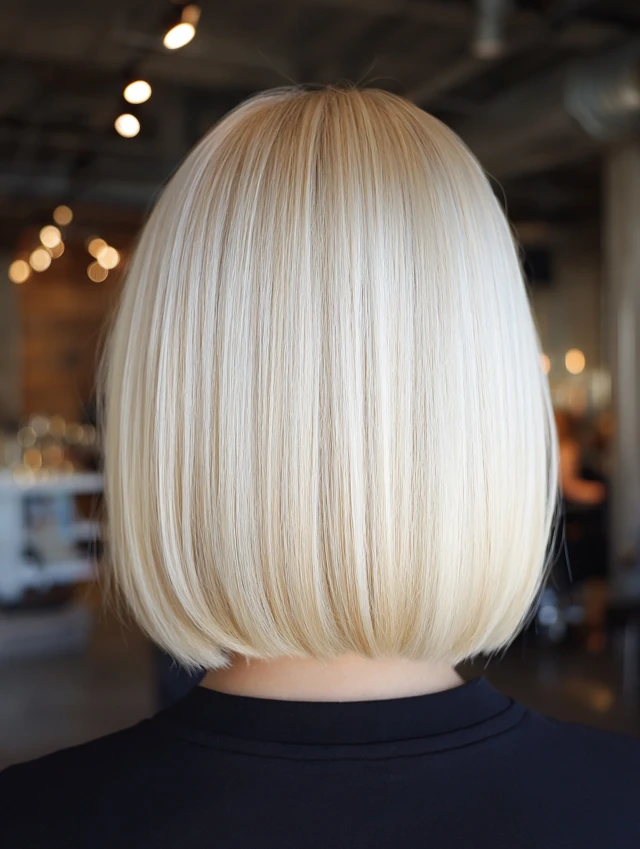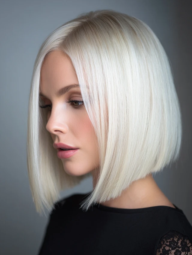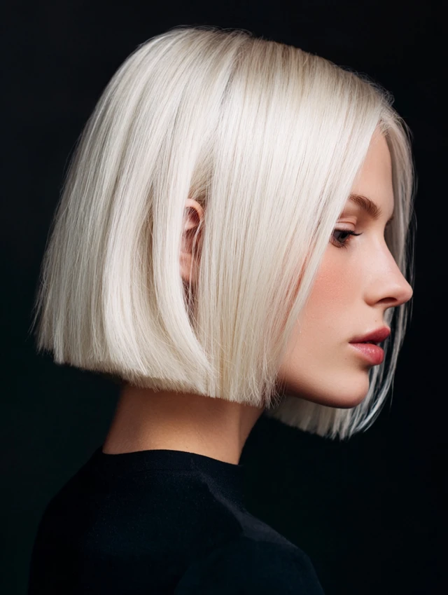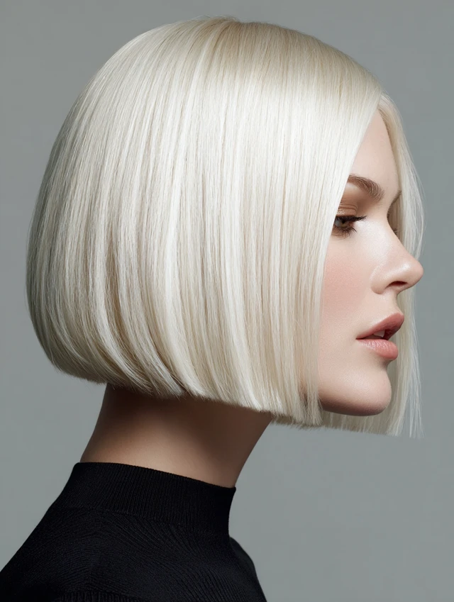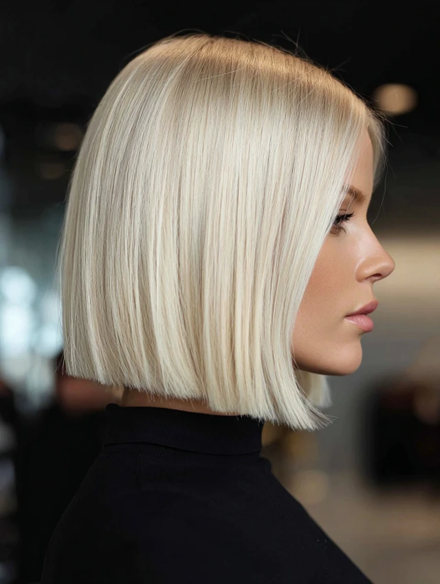 An icy blonde sleek bob creates a polished, high-impact finish. Straight styling emphasizes clean lines. This cut flatters square and oval face shapes.