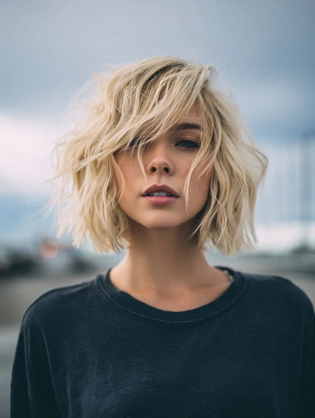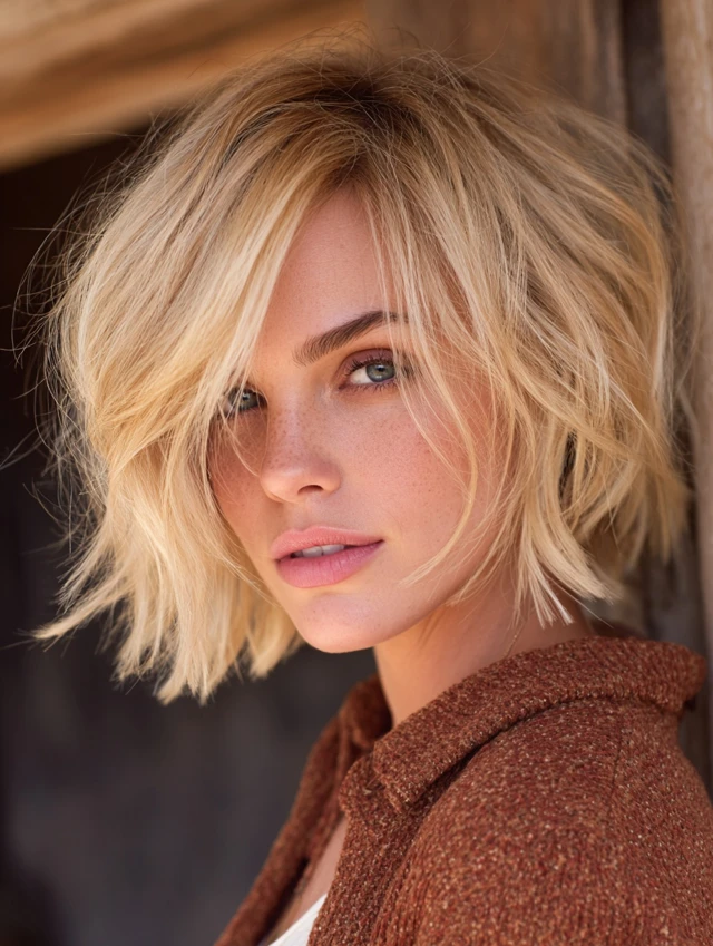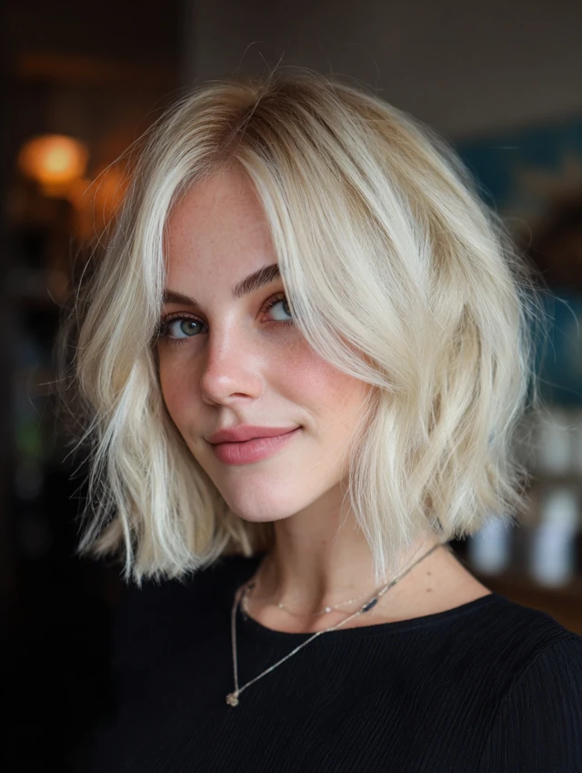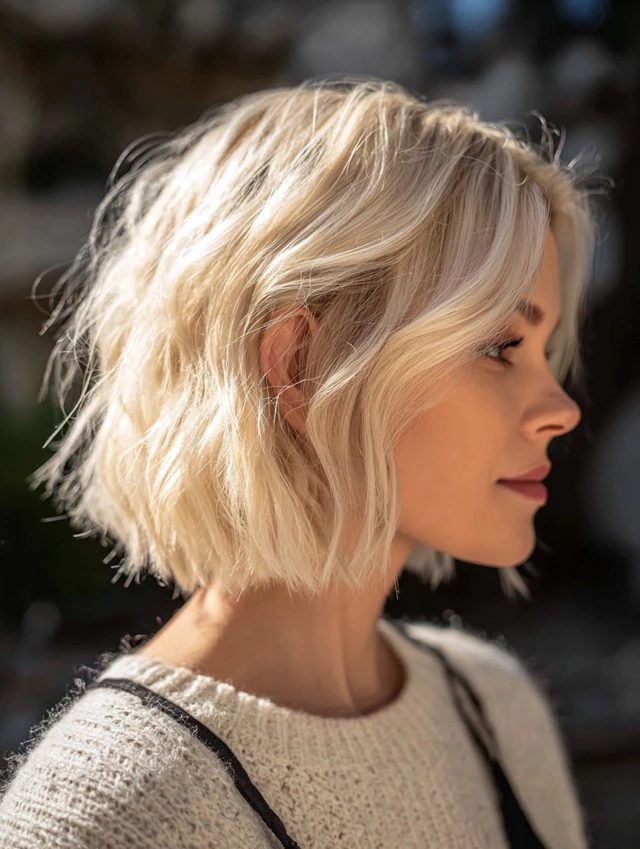A textured blonde bob adds movement and dimension. This works especially well for medium to thick hair. Round faces benefit because the texture creates elongation.
