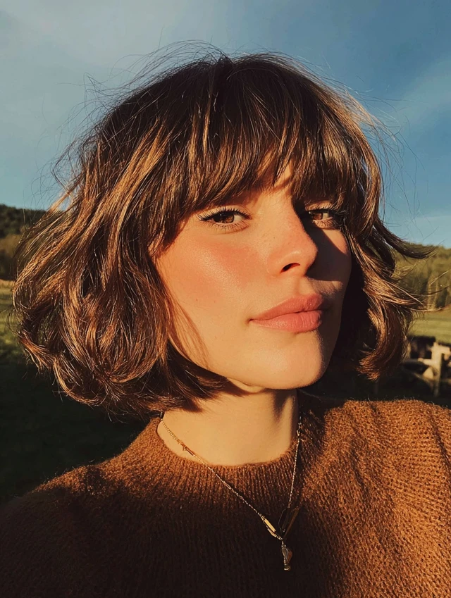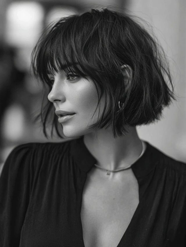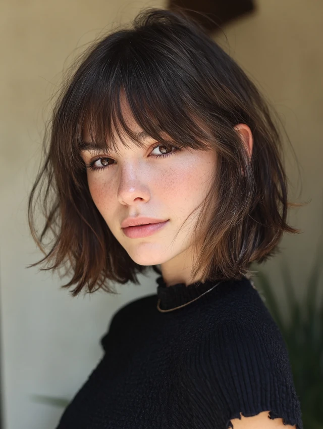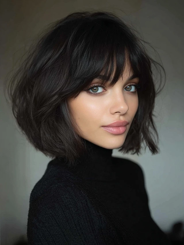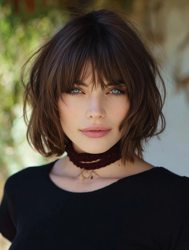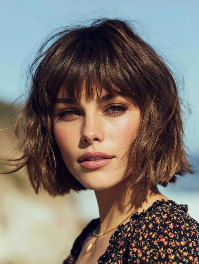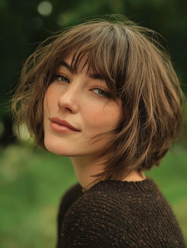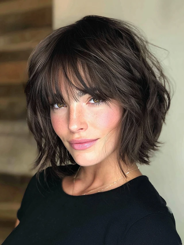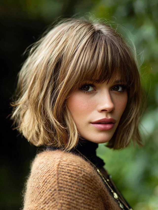 A layered bob paired with wispy bangs creates softness and movement. This style flatters round and square faces because the light fringe breaks up heaviness.