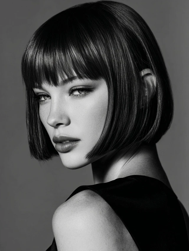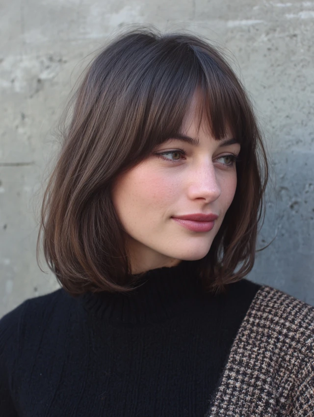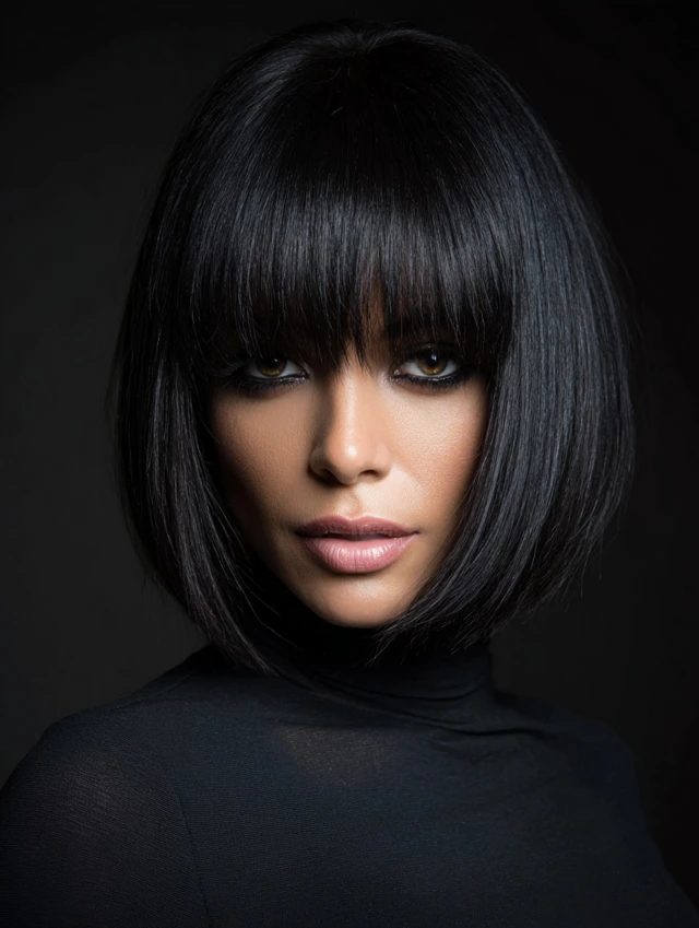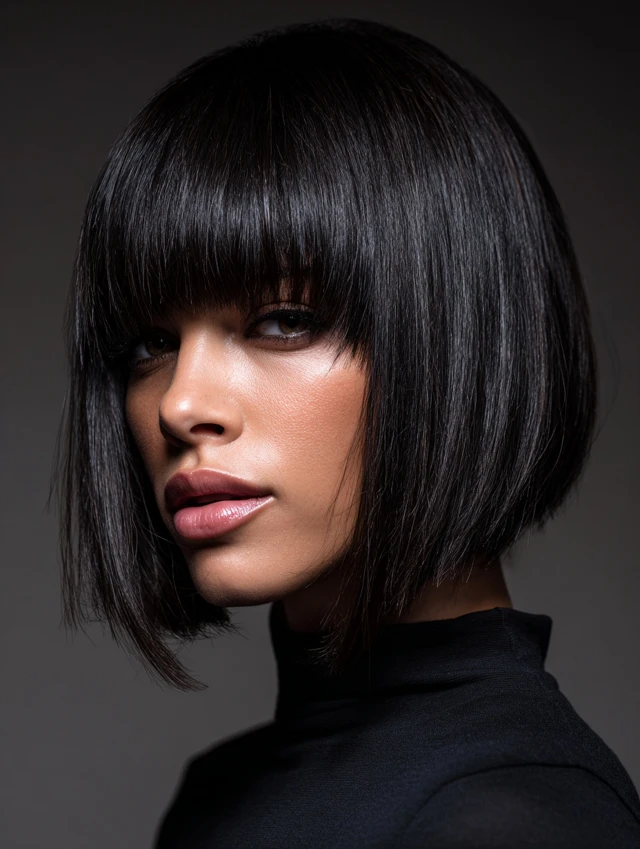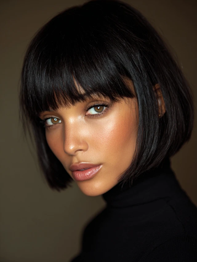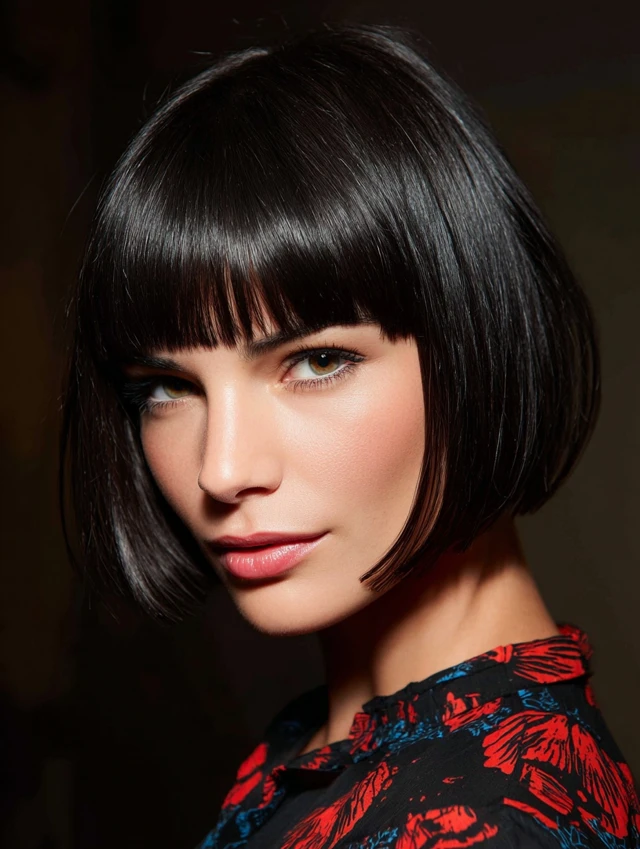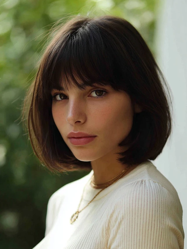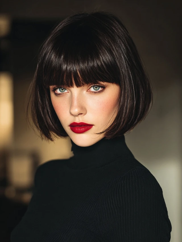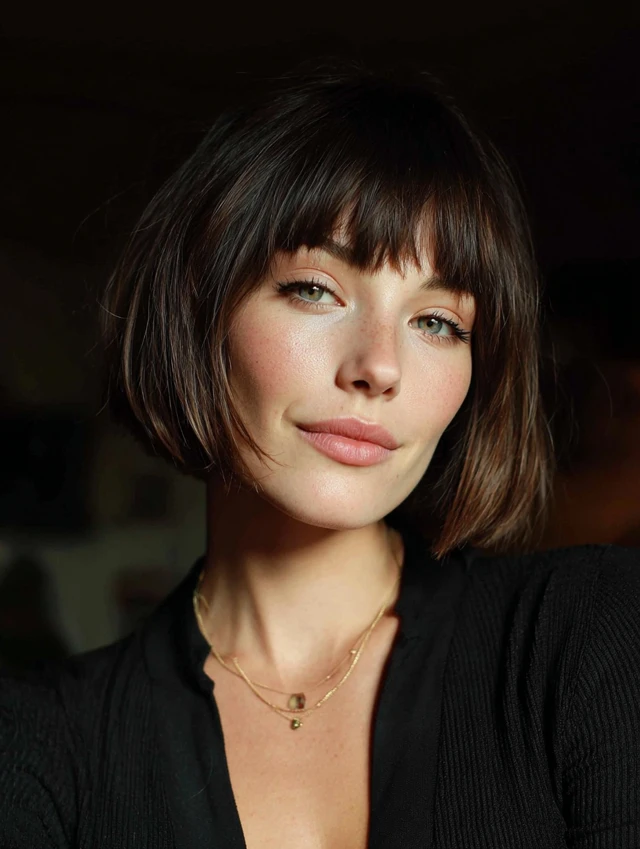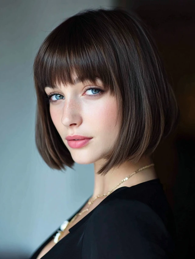 A blunt bob with full bangs creates a bold, graphic look. This style suits oval and heart-shaped faces best. The straight-across fringe highlights the eyes and gives strong structure.