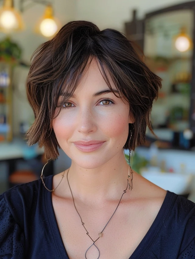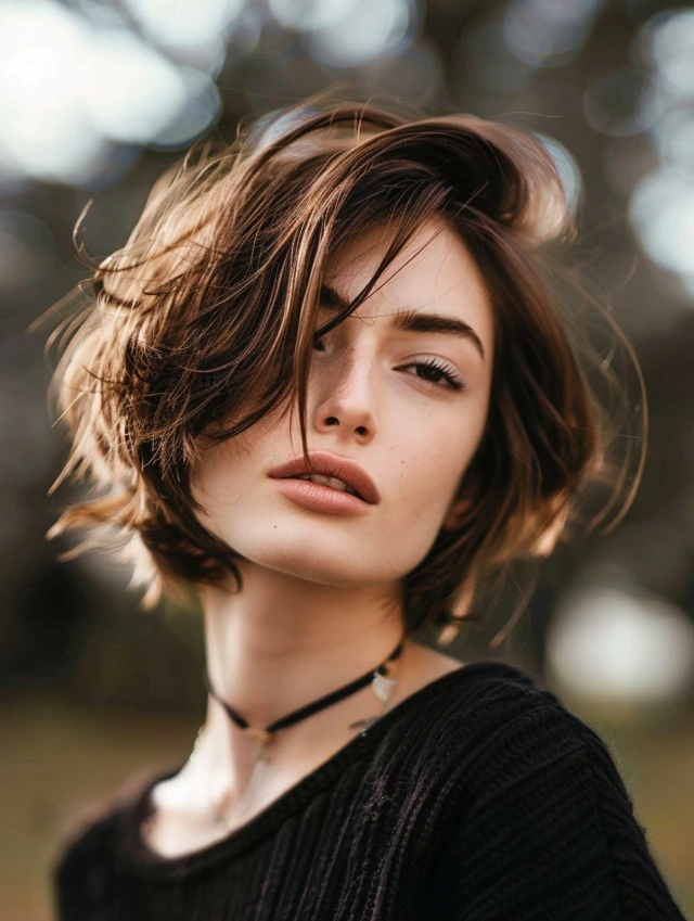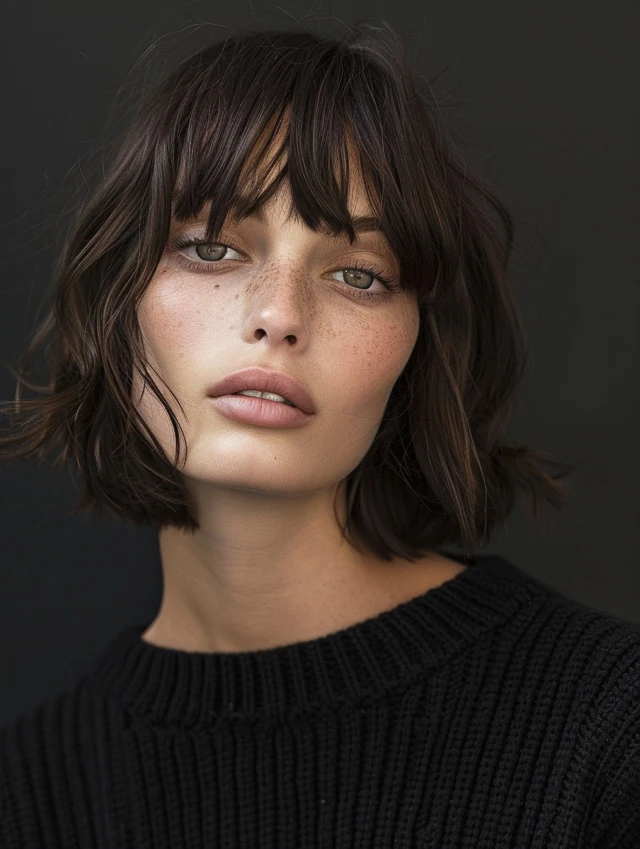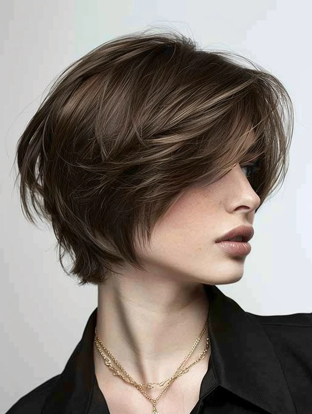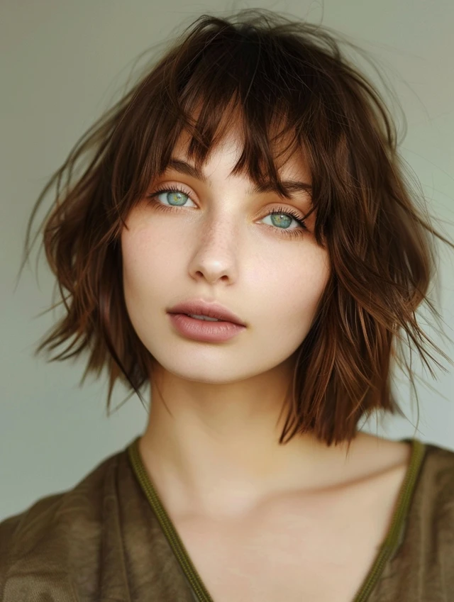 Adding bangs to a choppy bob softens the forehead and adds personality. Side-swept or wispy bangs suit round, square, and heart-shaped faces, drawing attention to the eyes and balancing facial proportions.