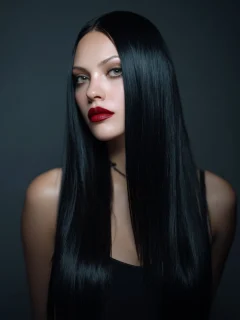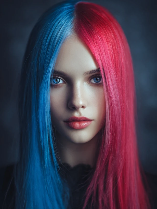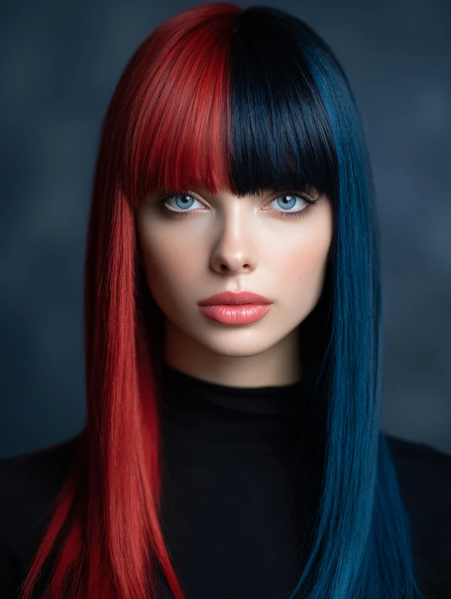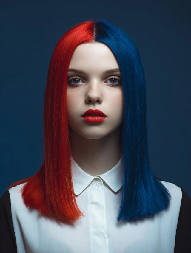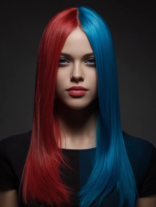 Split-dyed hair adds strong visual impact. This style suits symmetrical face shapes because the color line emphasizes balance. Straight or slightly wavy hair works best for a clean split.
