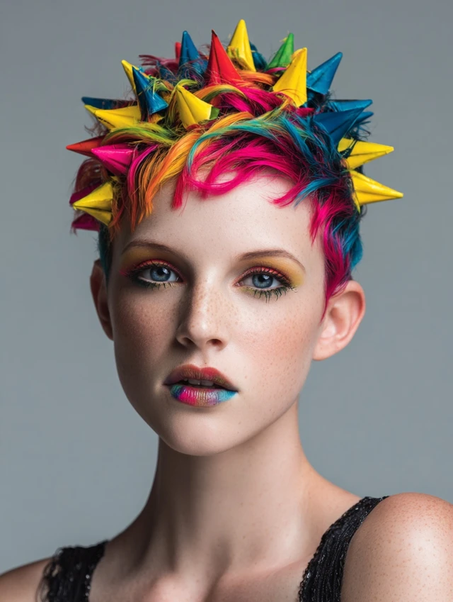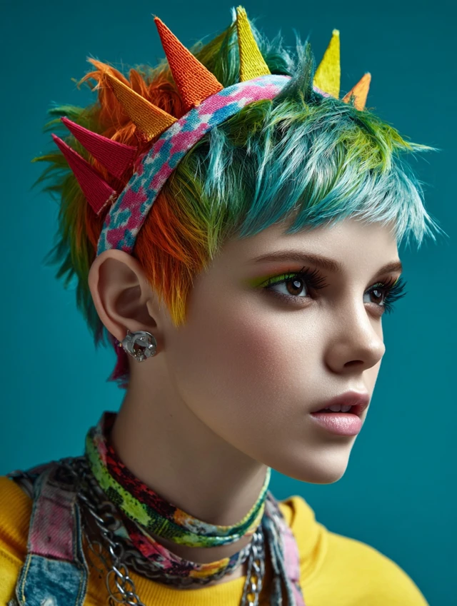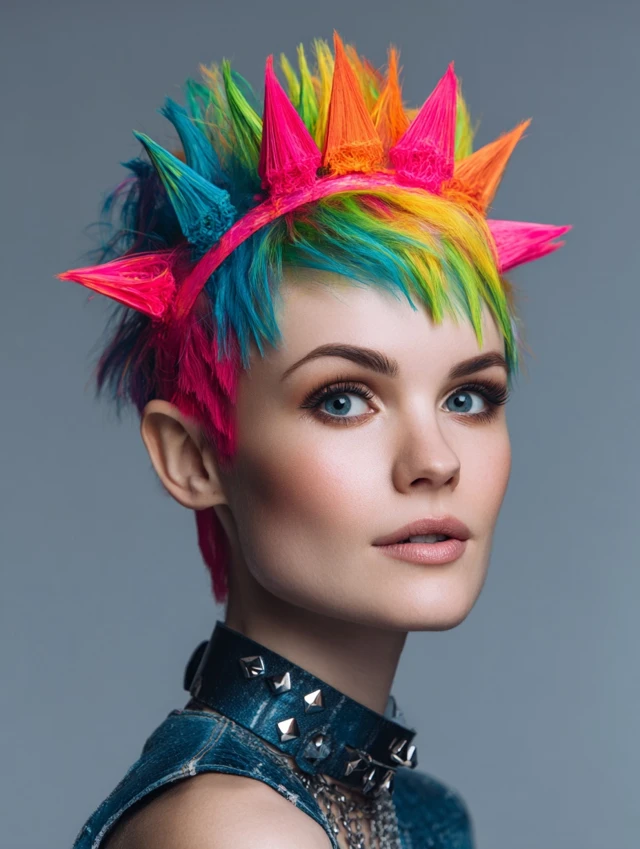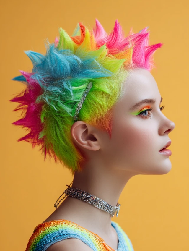Short spiked hair in neon shades creates a sharp, energetic look. It suits angular and petite faces well. Straight hair holds spikes more easily with strong gel or wax.