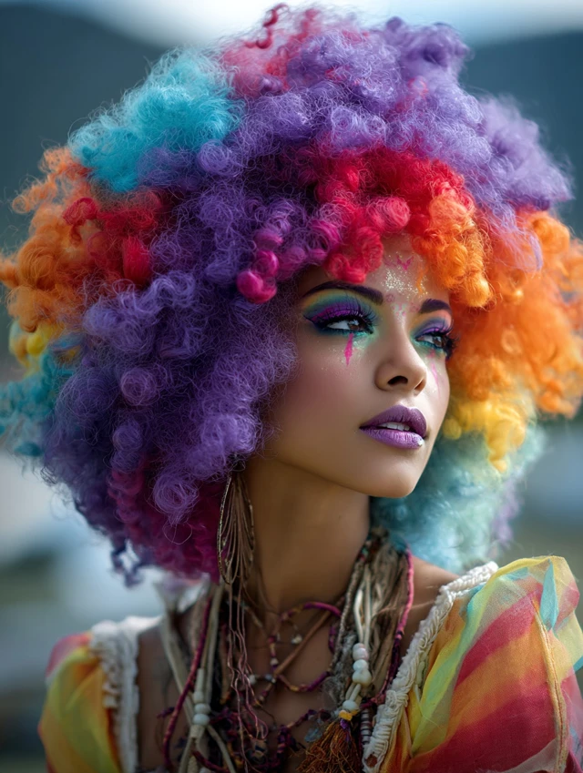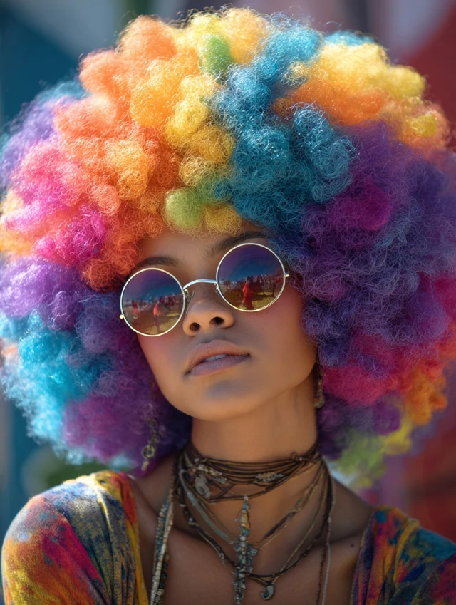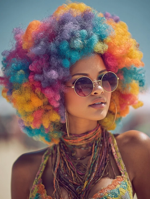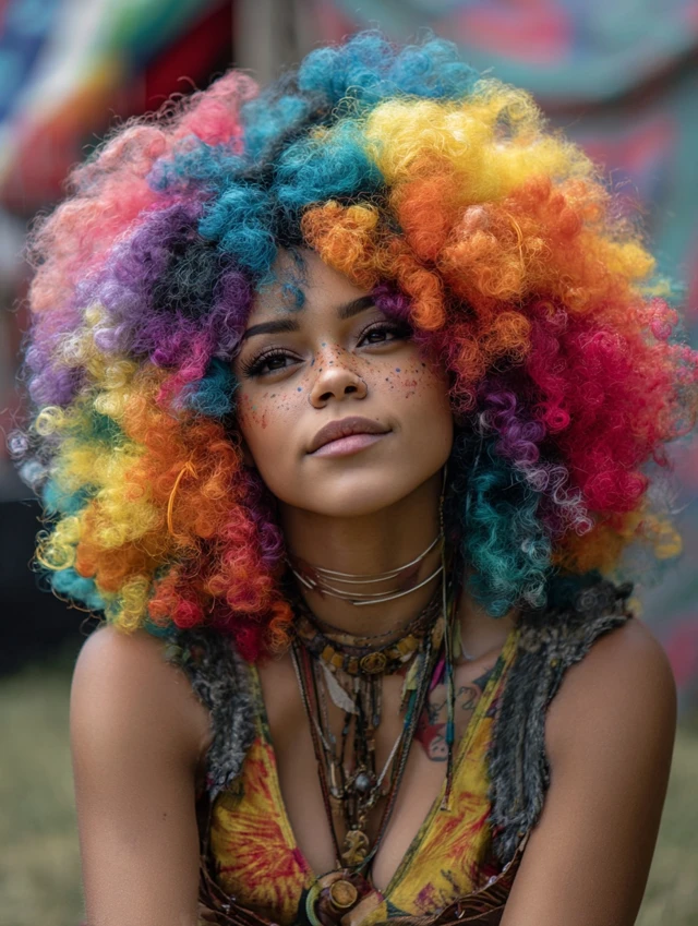 A rainbow afro celebrates volume and texture. It suits oval and long faces because the round shape adds width. Natural curls hold this style beautifully.