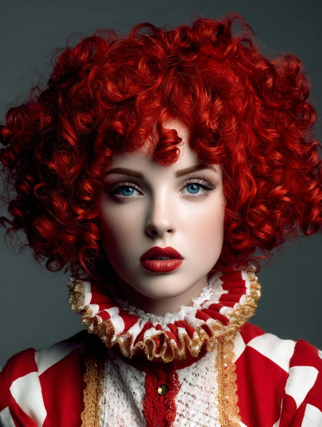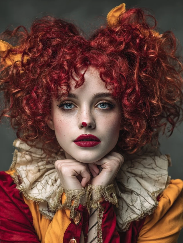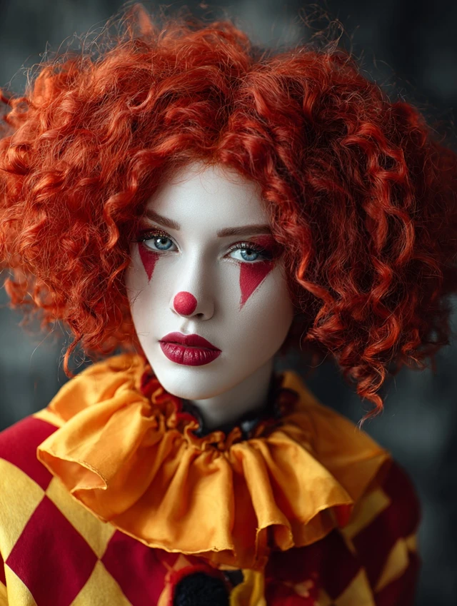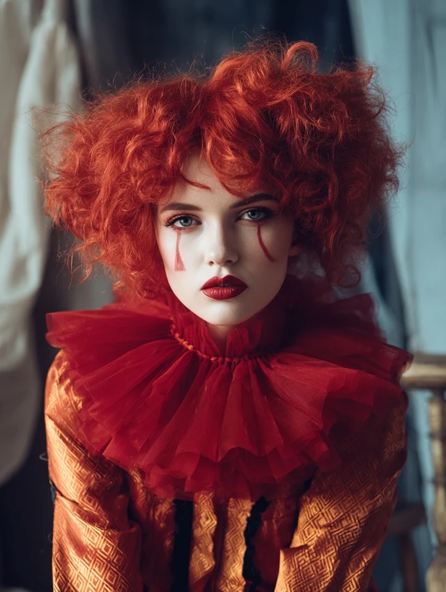 Big red curls create the most recognizable clown look. This style suits round and oval faces because the volume balances proportions. Thick or naturally curly hair works best, but wigs can achieve the same effect.