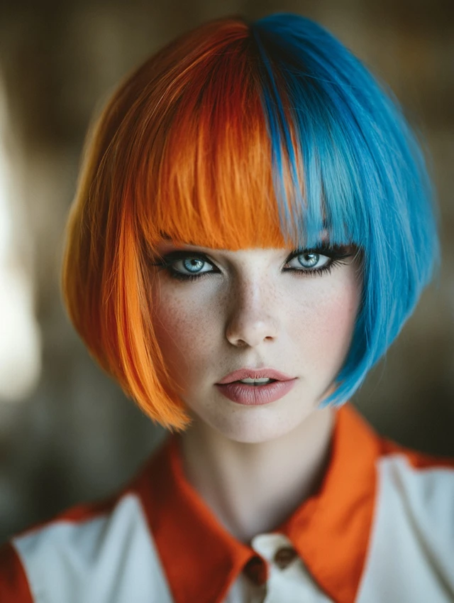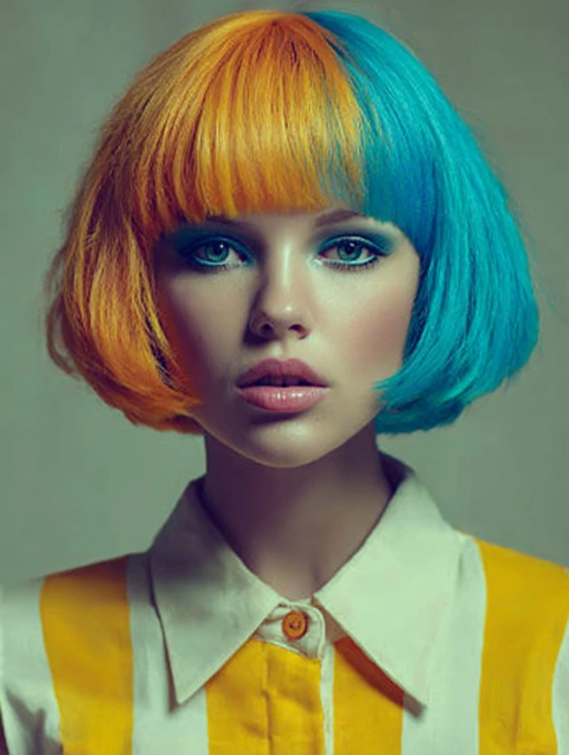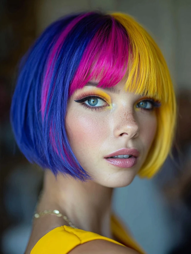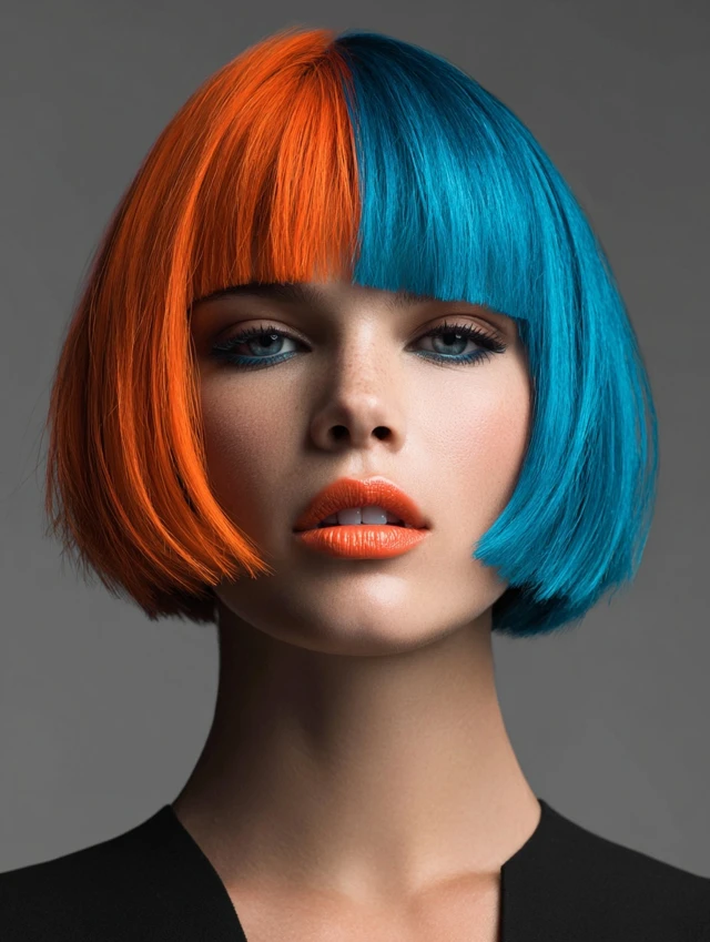 A chin-length bob with two bold colors feels modern and creative. It suits square and oval faces because the blunt edge adds structure. Fine to medium hair works best for clean lines.