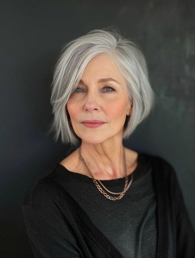 A layered bob adds dimension to gray hair while framing the face elegantly. It suits most face shapes, especially round or square faces, as the layers soften features. Medium to thick hair textures hold layers well, creating natural volume and bounce.