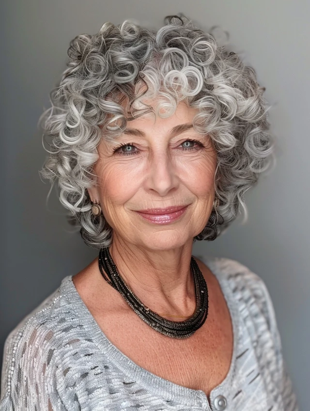 Curly short gray hairstyles embrace natural curls while keeping length manageable. They suit round or square faces by softening angles and adding lift. Medium to thick curly hair works best, as layers help define curls and prevent bulkiness.