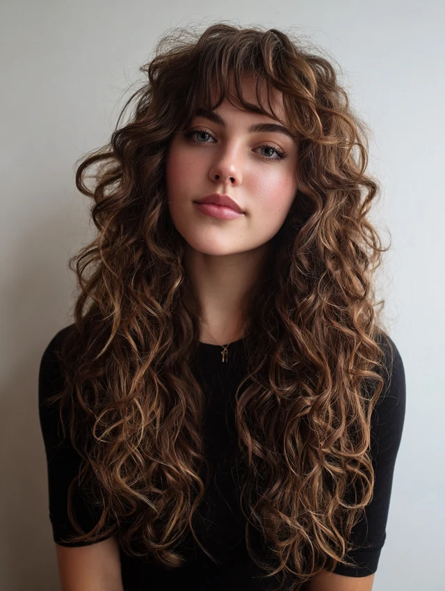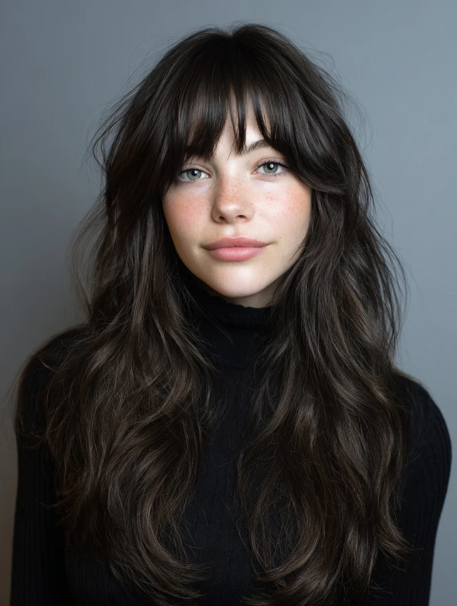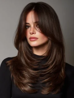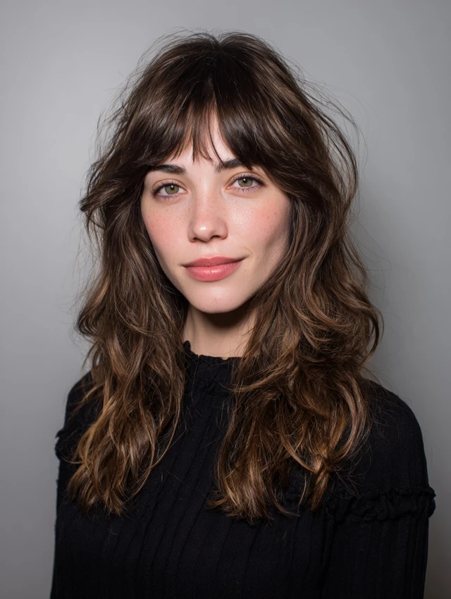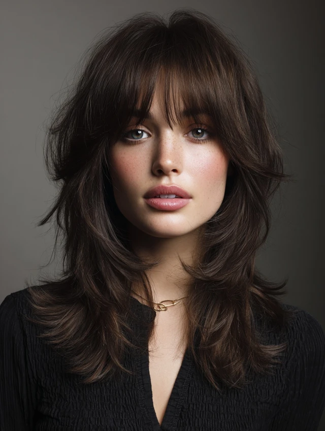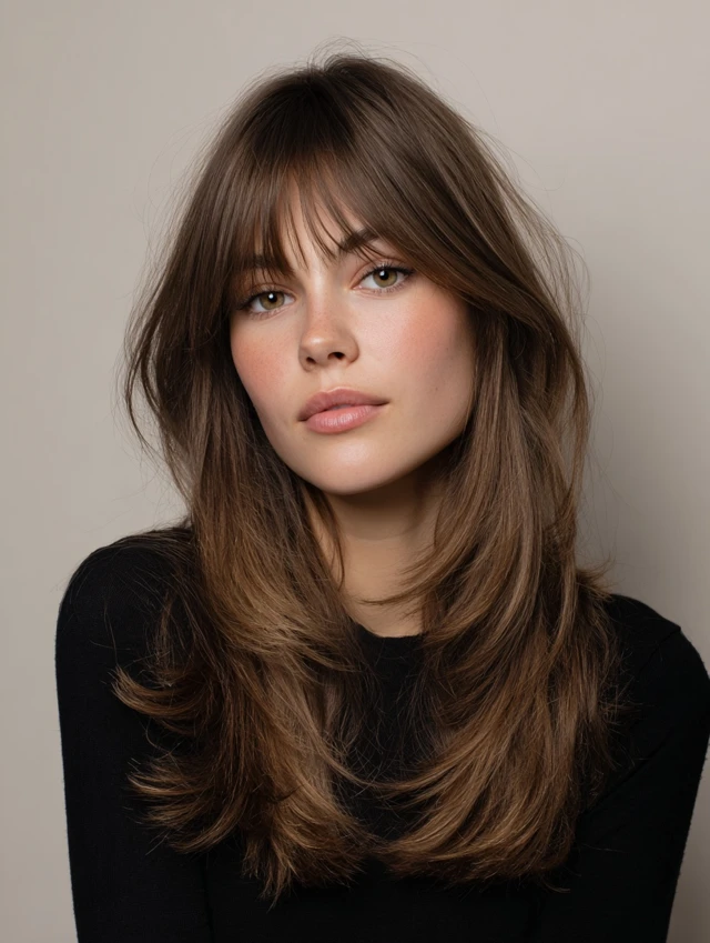 Curtain bangs soften the face and blend seamlessly with voluminous layers. Works for oval, heart, and round faces by highlighting eyes and cheekbones. Straight, wavy, or lightly curly hair adapts well.