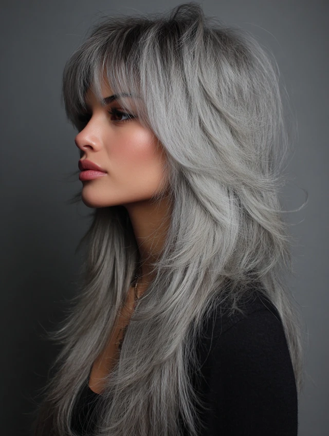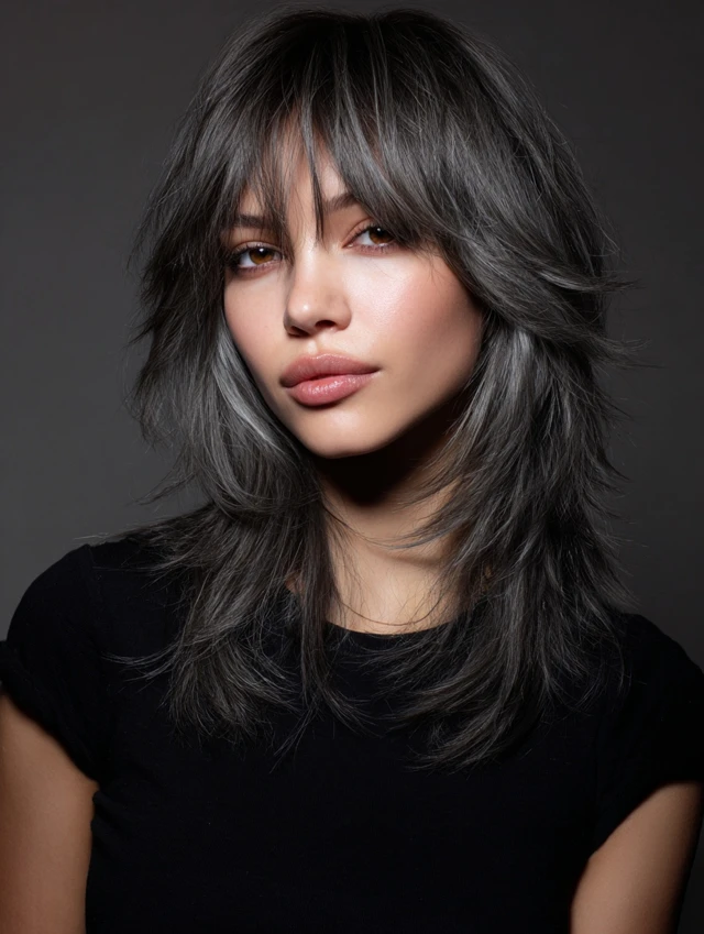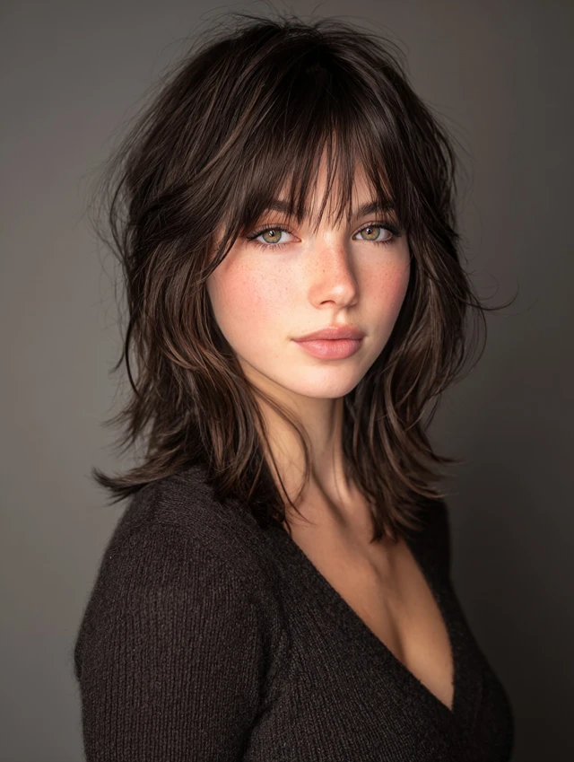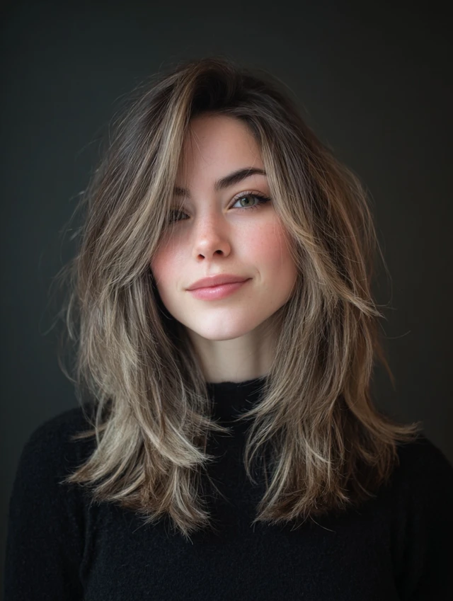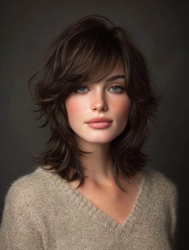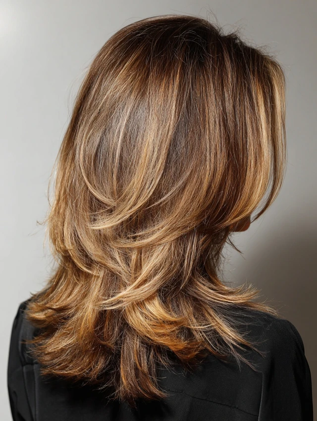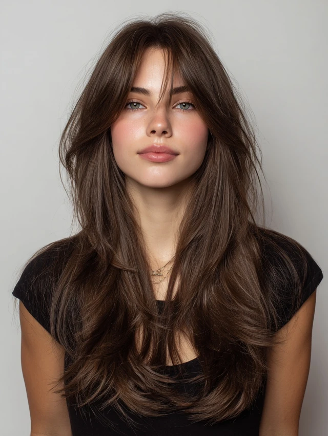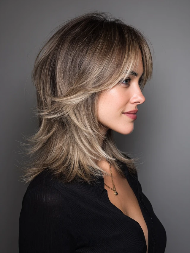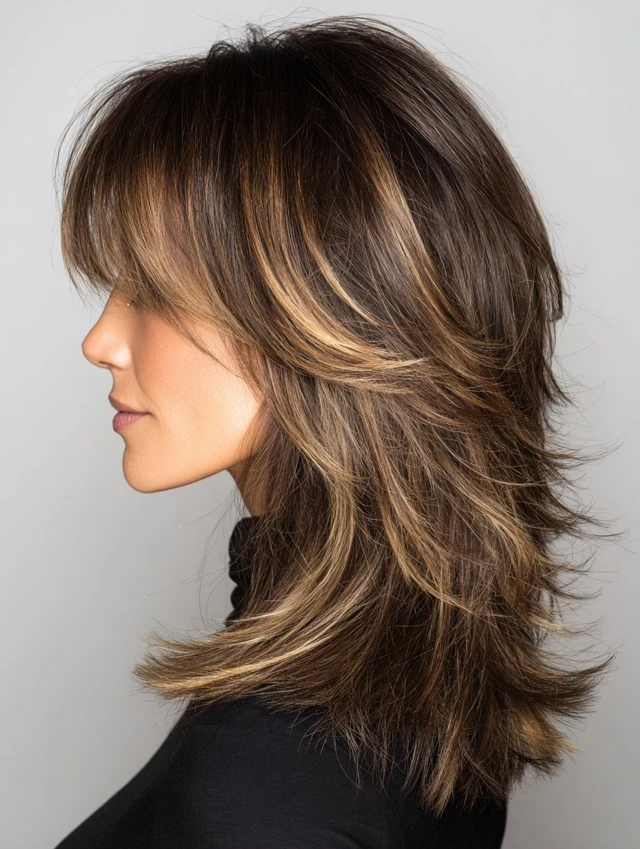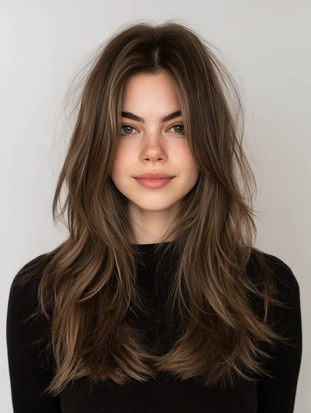 This style features choppy layers at the crown with feathered, flowing ends. It works for oval, heart, and square faces, adding volume and movement without losing shape. Straight or slightly wavy hair shows the fluffiness best.