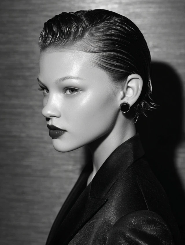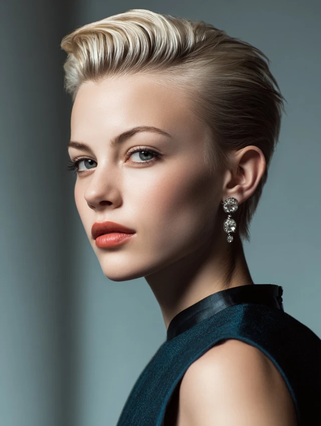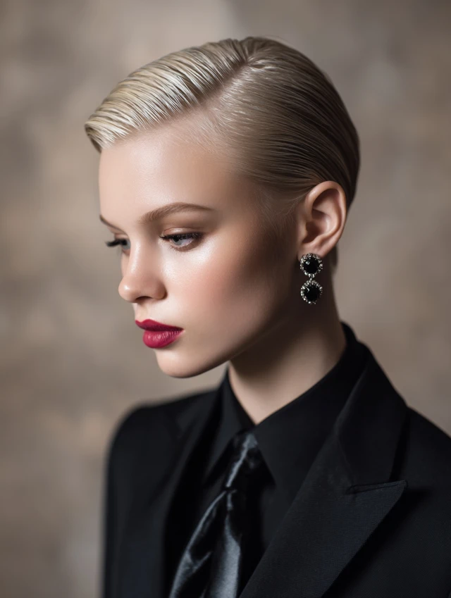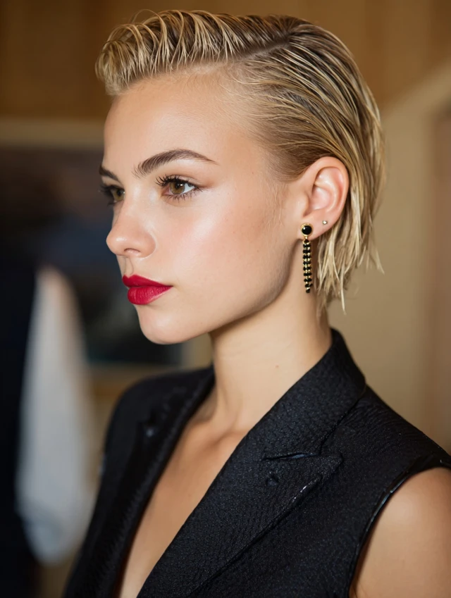 A slicked-back style creates strong, clean lines. It suits angular and round faces by elongating the profile. This works best on pixie-length cuts.