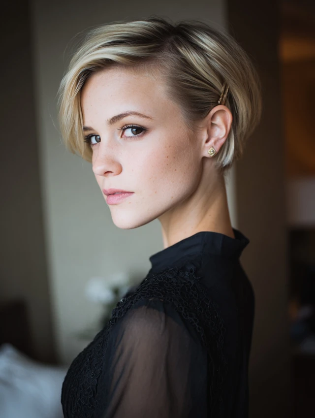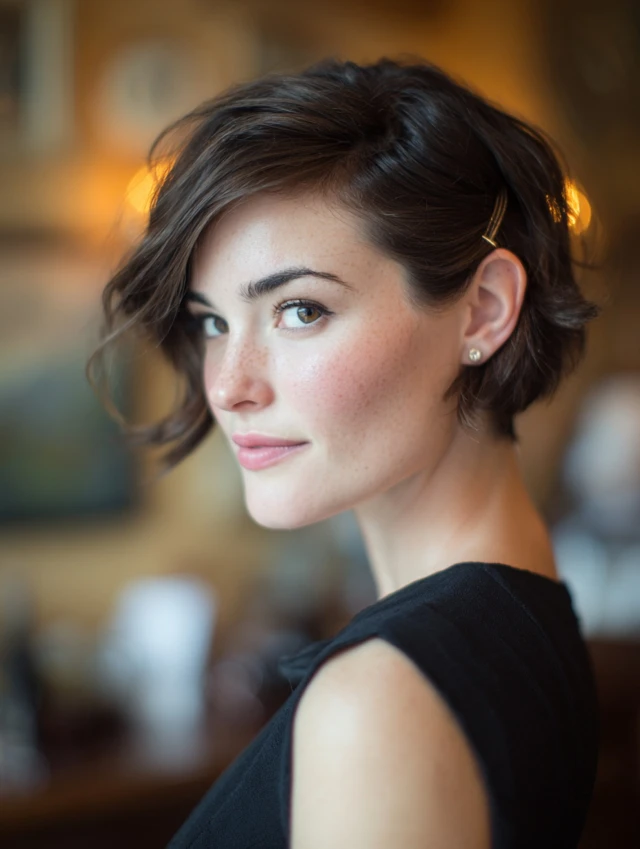 Pinning back one or both sides creates a subtle updo effect. This style suits heart and oval faces by highlighting cheekbones. It works well on pixie cuts and short bobs.