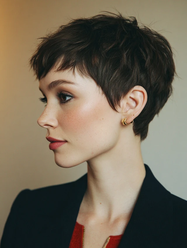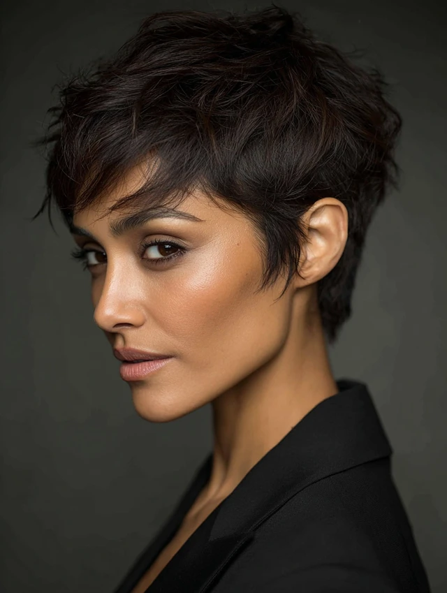 A textured pixie can look bold and refined. It suits oval and petite faces especially well. The layered top adds movement while keeping the sides controlled.