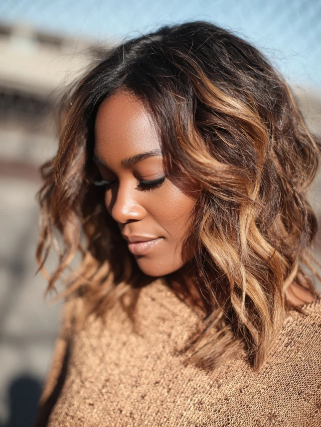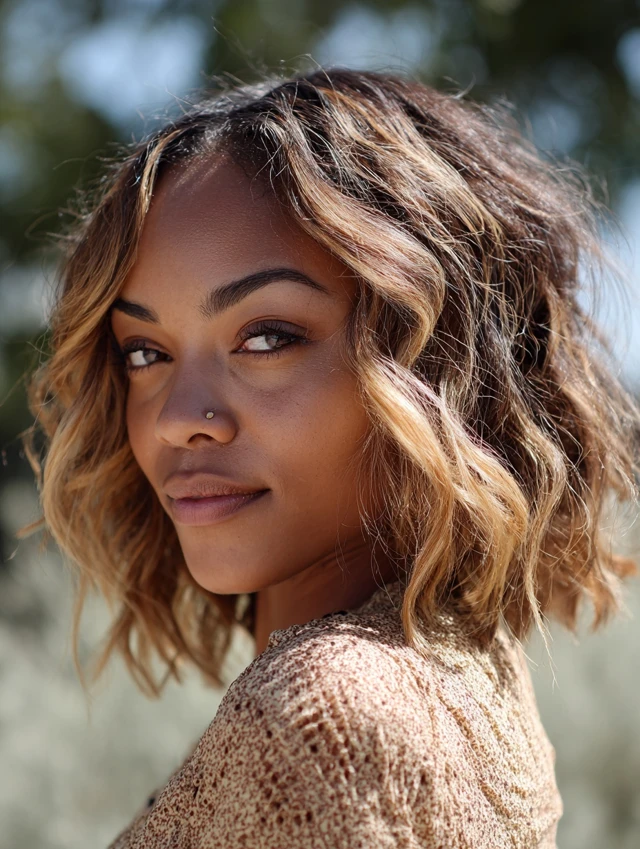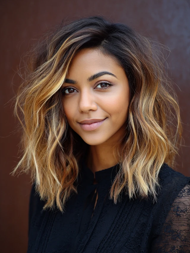 Keep highlights subtle and blended. Style with waves to show dimension. Maintenance includes toning to prevent brassiness.