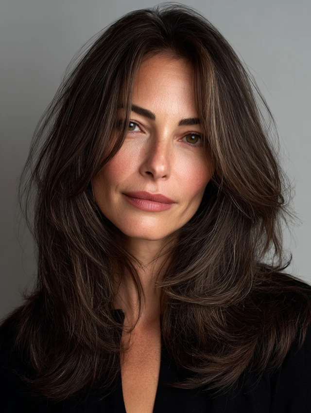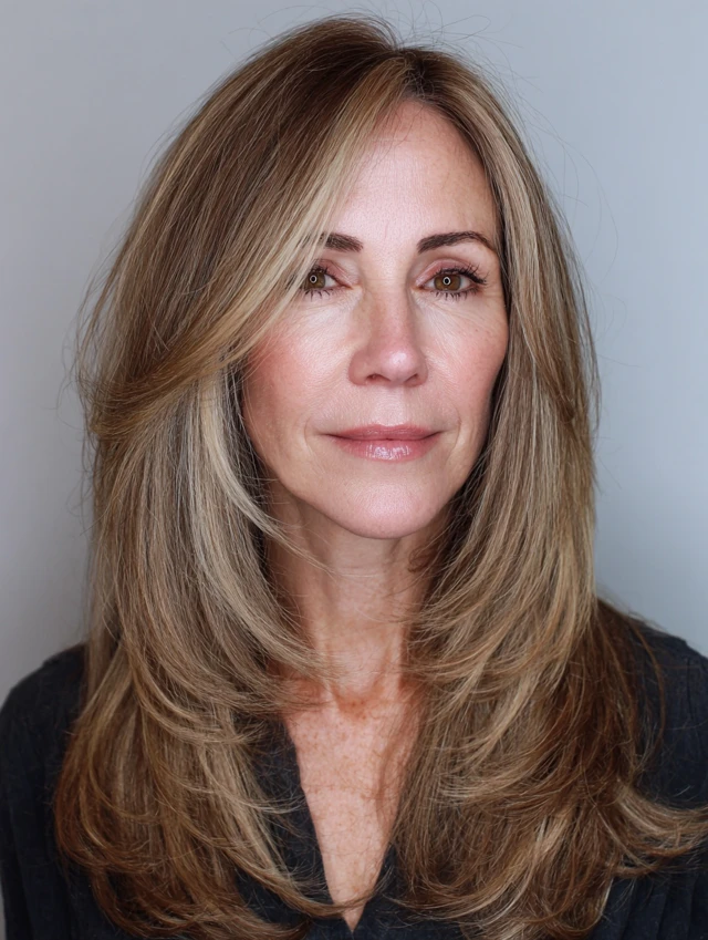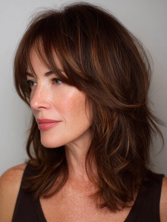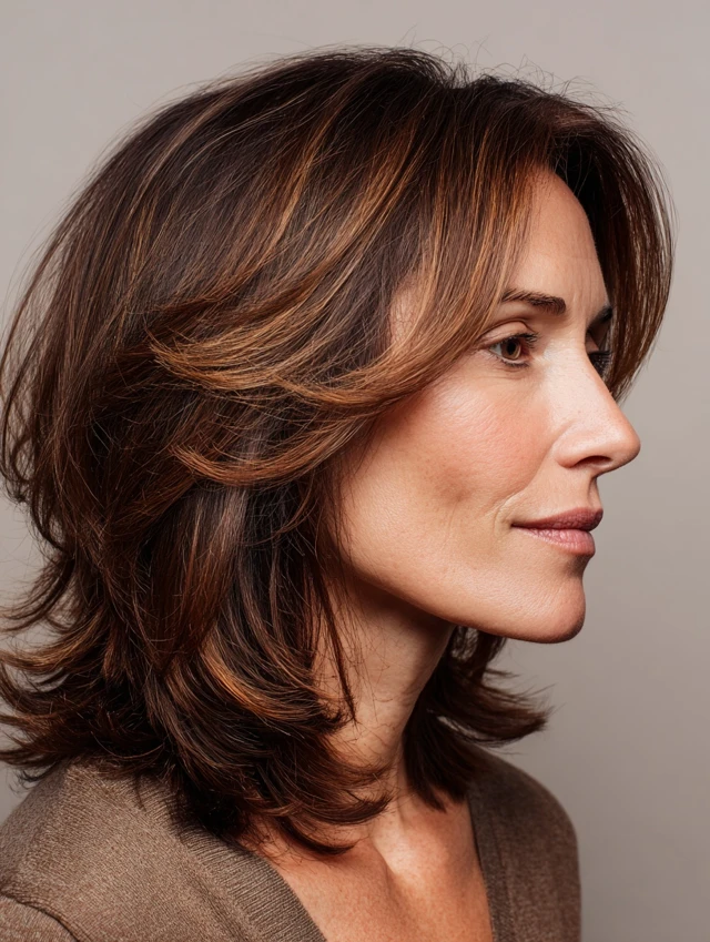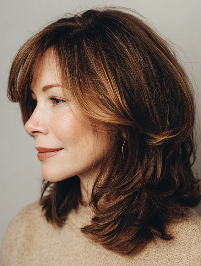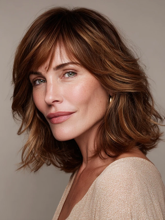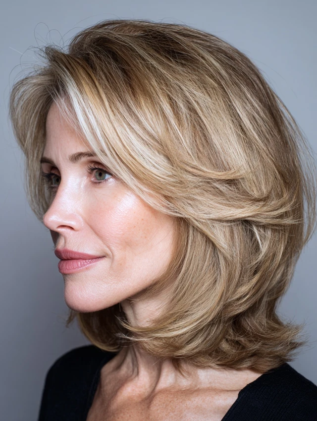 Side-swept waves frame the face and draw attention away from angular jawlines. Minimal styling is needed, making it perfect for women over 40 seeking an effortless, flattering style.