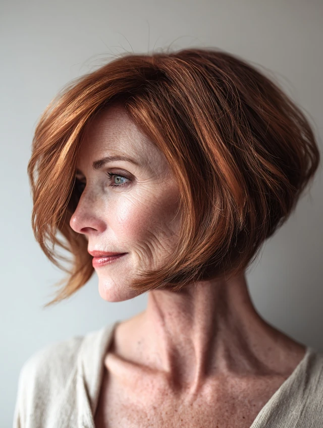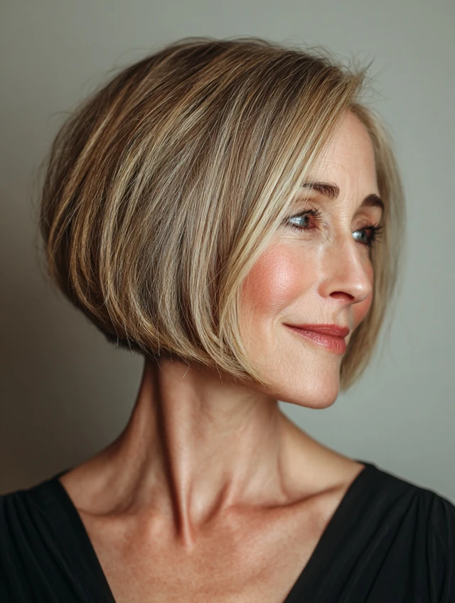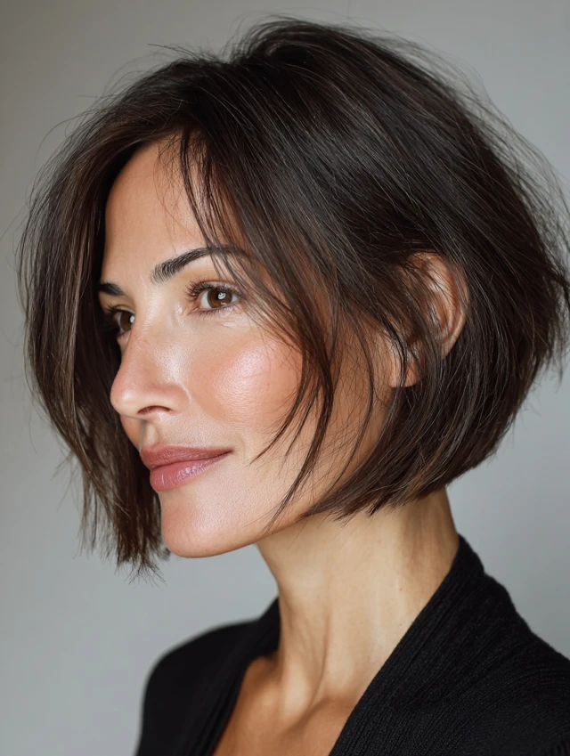 Minimal styling with smoothing serum or mousse keeps the cut polished. The angled bob is modern, professional, and low-maintenance, perfect for women over 40.