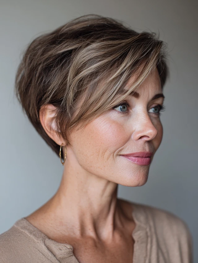 A pixie with a deep side part softens angular features while adding volume at the crown. Works best for fine to medium hair and is ideal for women who prefer short, low-maintenance styles.