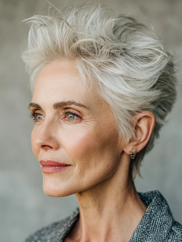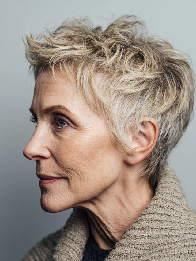 A textured pixie removes excess weight and adds lift at the roots. Short layers create natural volume and prevent hair from collapsing. This cut highlights facial features and works well for fine hair.