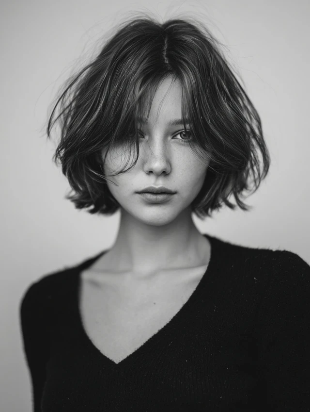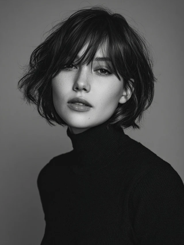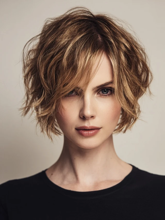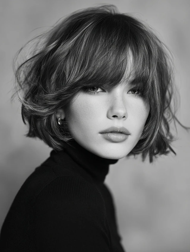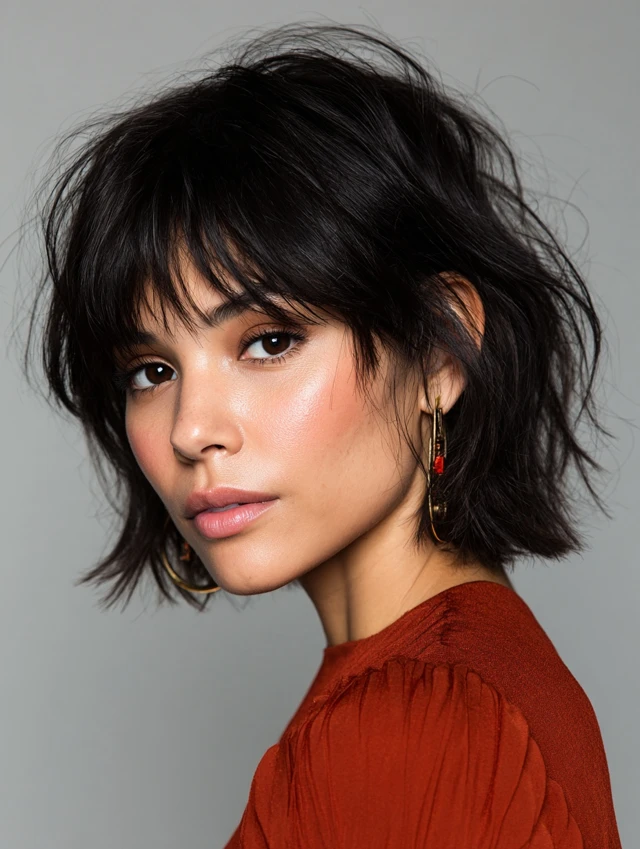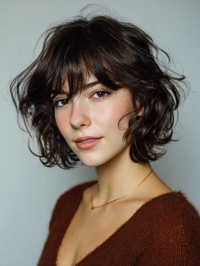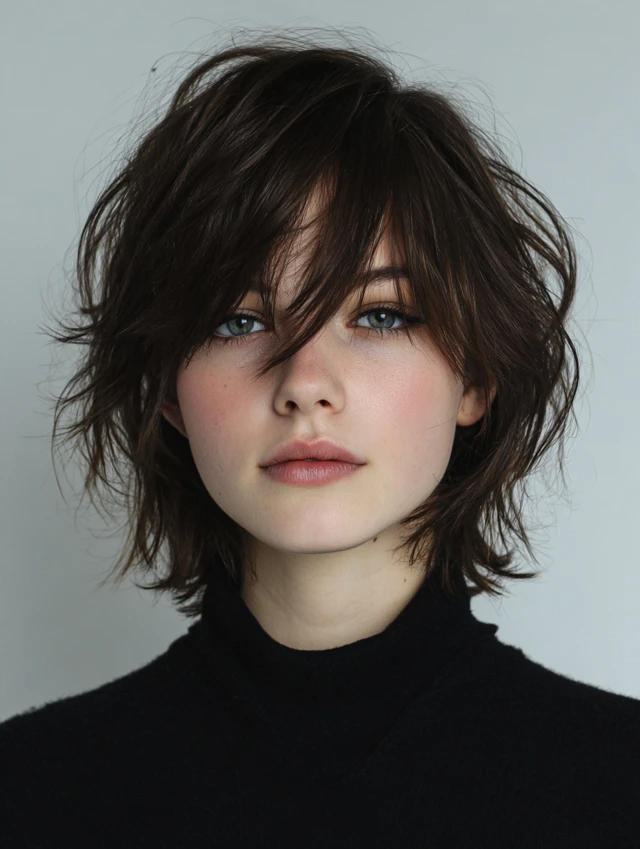 Side-swept bangs create a gentle, asymmetrical frame. The rest of the cut retains a choppy bob shape. It works for round or oval faces, softening the cheeks and highlighting eyes. Medium to thick hair benefits most.