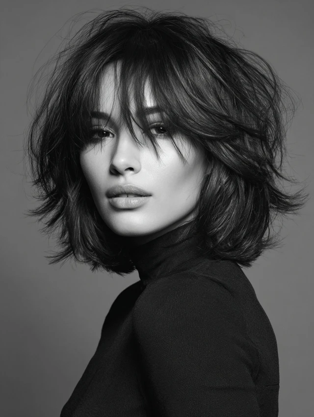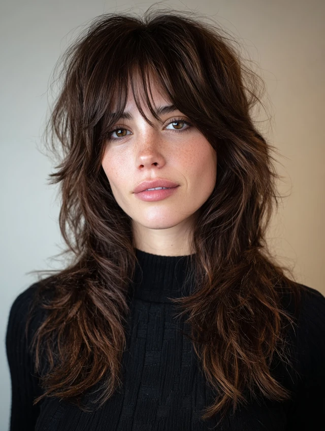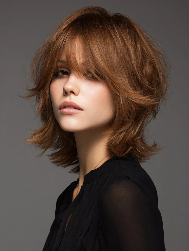 This shag cut features heavy layers and choppy ends for an edgy, voluminous look. It suits oval, heart, and long faces, adding movement to medium or thick hair.