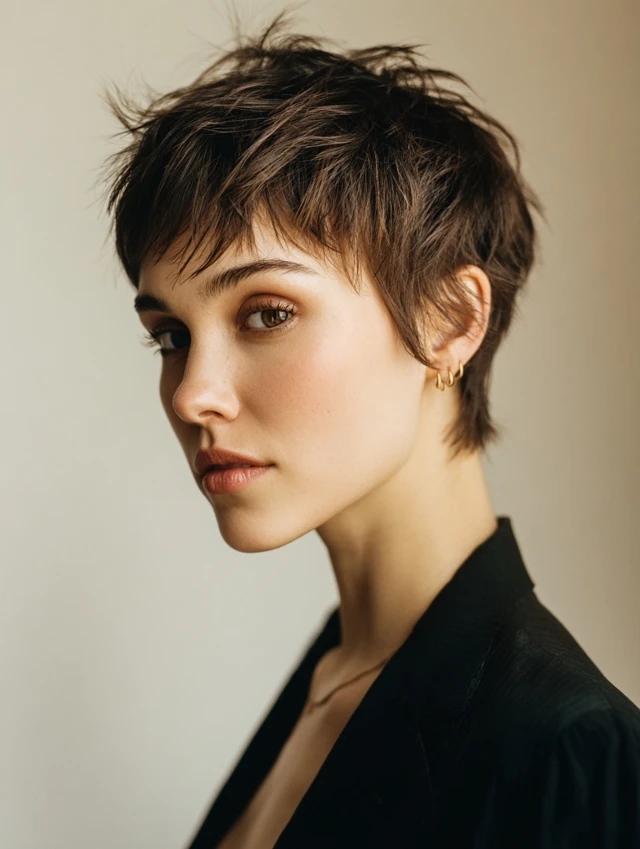 Styling is minimal. Light mousse, wax, or cream defines layers and adds movement. Perfect for active lifestyles or low-maintenance routines. Regular trims every 4–6 weeks maintain the choppy, textured effect.