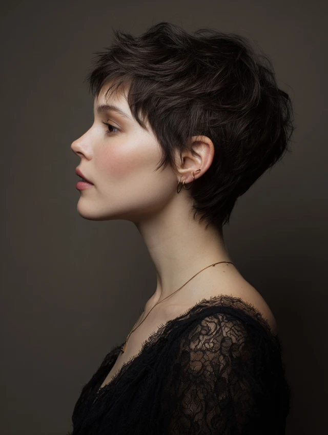 A short pixie with layers adds height and texture. Works for oval, heart, and long faces, especially on fine or thin hair to create volume. The layers prevent a flat, lifeless appearance.