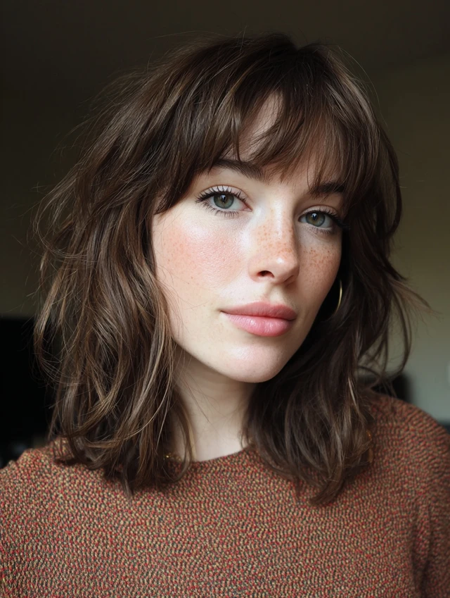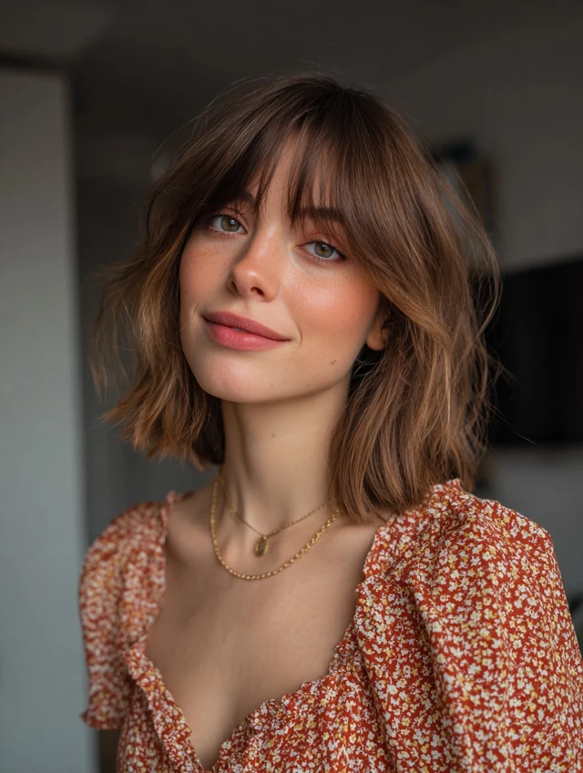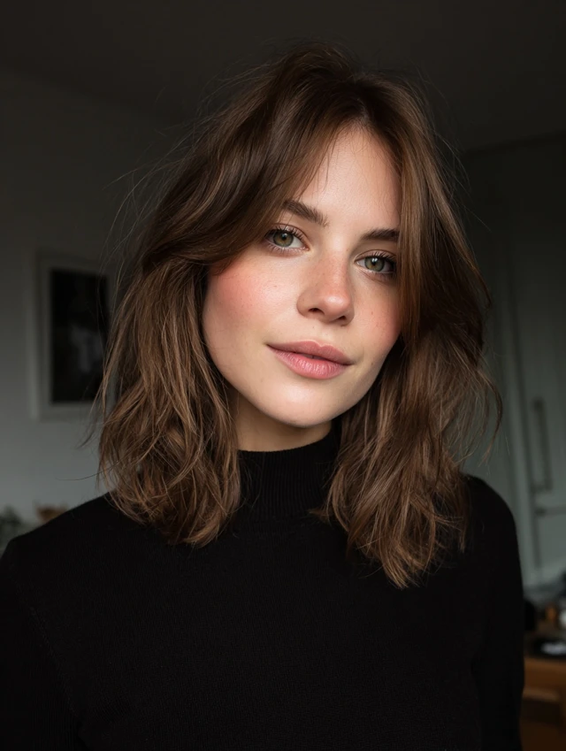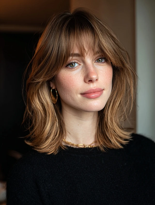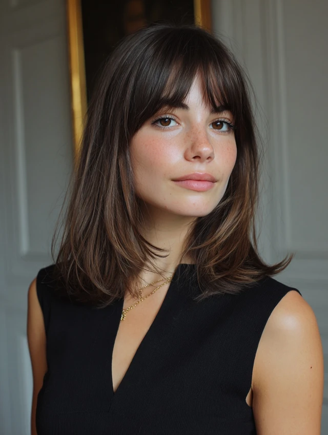 Blow-dry the bangs outward with a round brush. Keep the ends lightly textured for movement. This style works for both casual and dressy occasions. Expect light daily styling but simple upkeep.