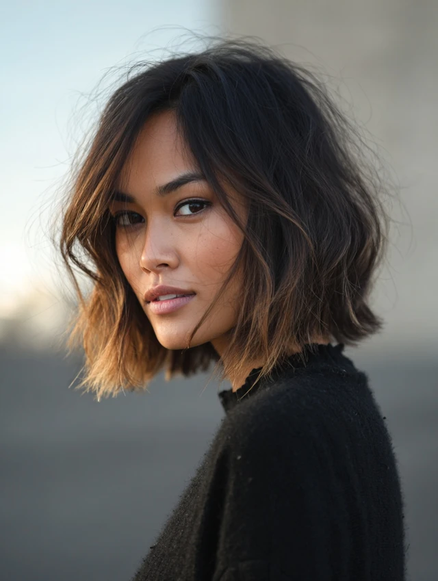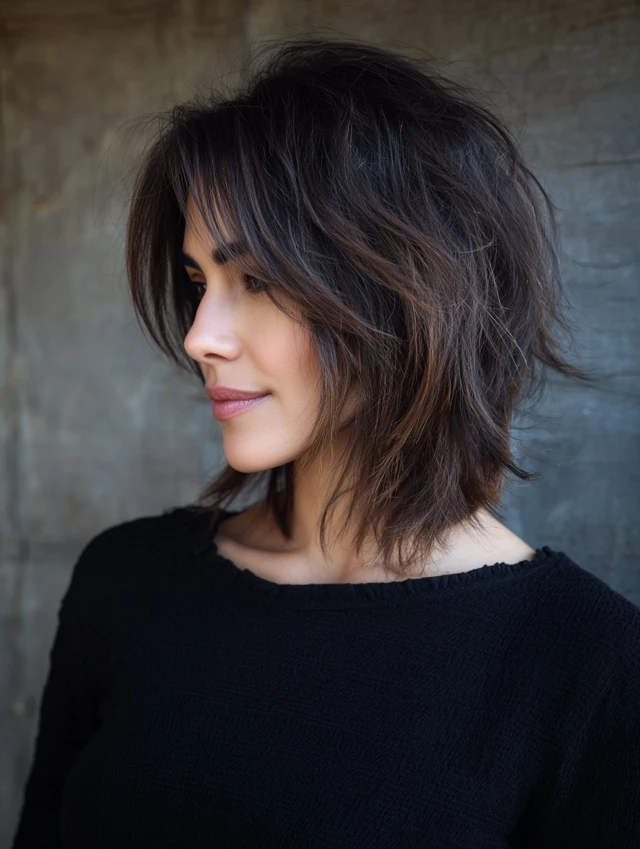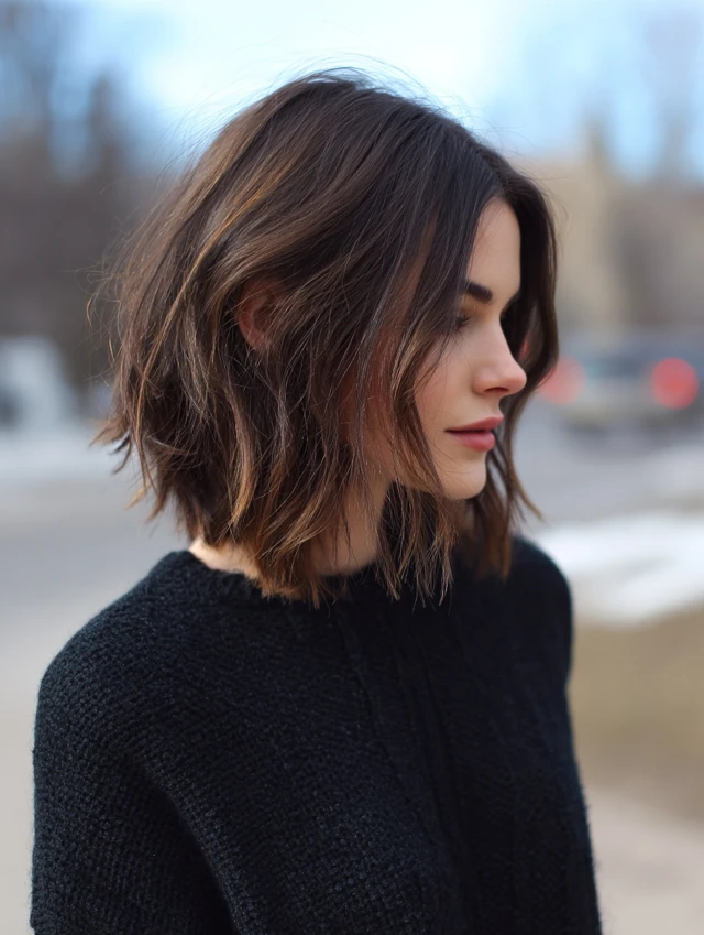 Choppy ends add edge and texture. This version works well on petite faces and sharp features. The uneven finish gives fine hair more body and prevents flatness. It creates a relaxed, modern vibe.