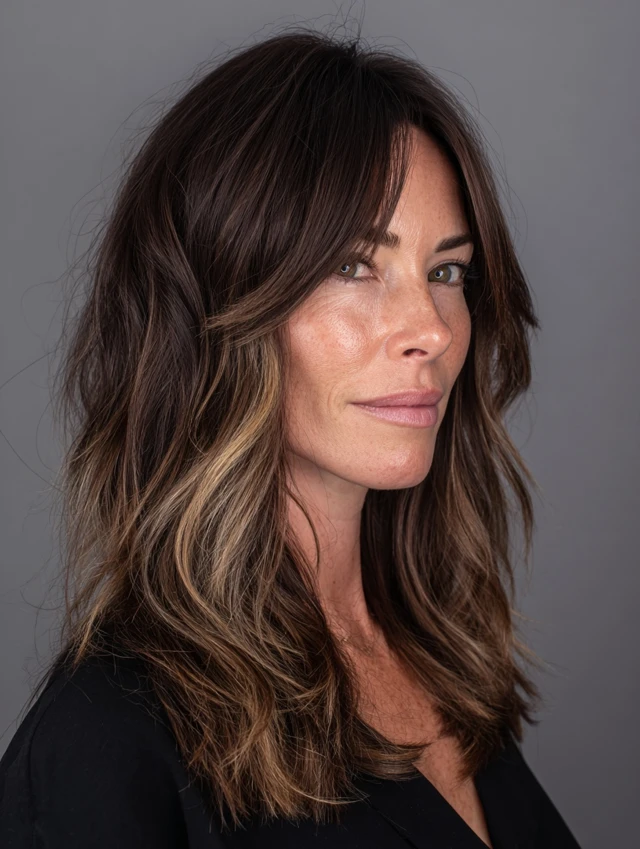 Shoulder-length layers enhanced by subtle or bold highlights to add depth and dimension. Works on oval and heart-shaped faces. Straight to wavy hair shows color and texture effectively.