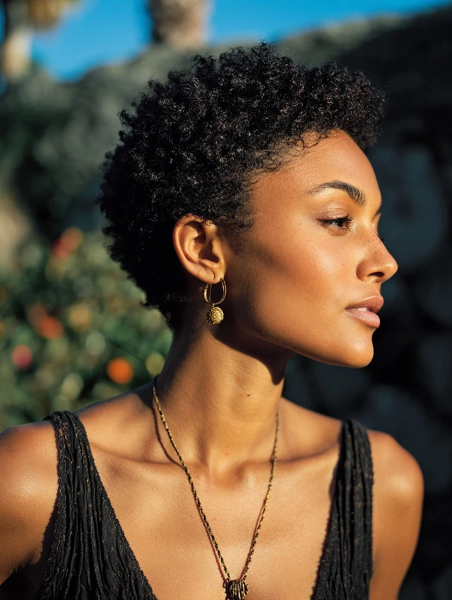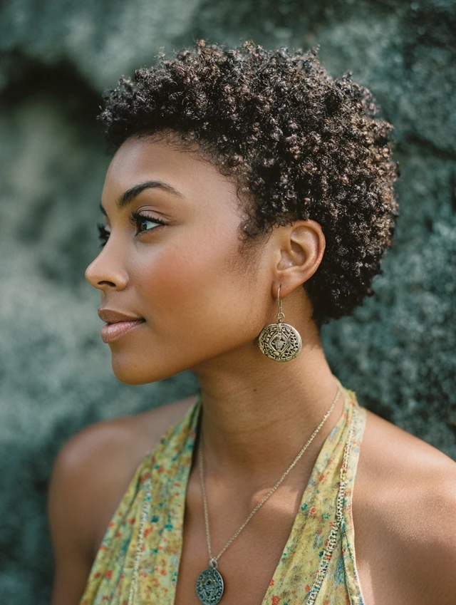 A textured natural pixie keeps coils defined and shaped. It suits most face shapes because volume placement can be adjusted.