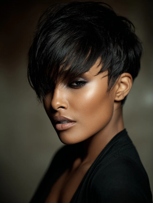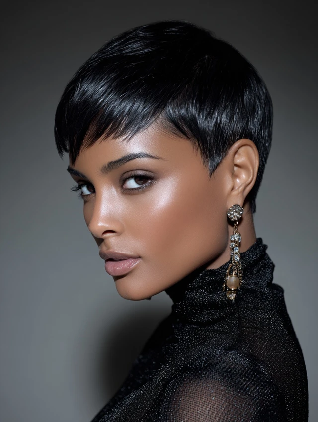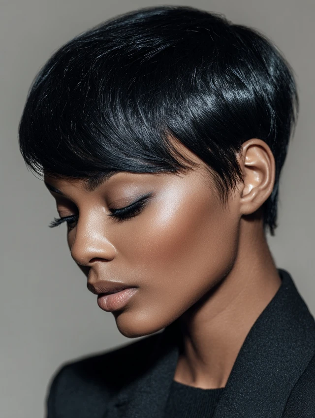 A pixie cut frames the face and draws attention to the eyes and cheekbones. It suits oval, heart, and petite face shapes especially well. The short length keeps hair controlled and structured.