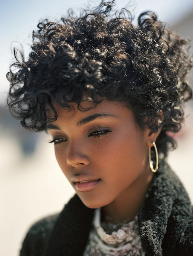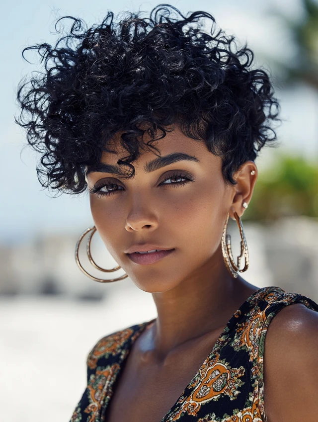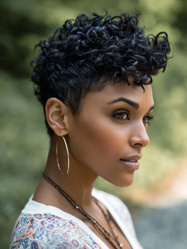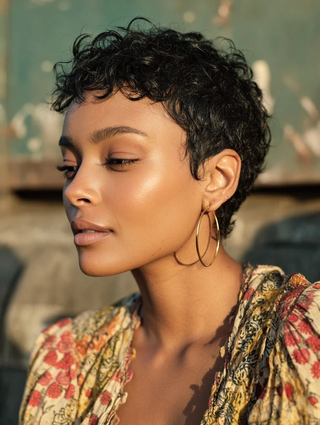A curly pixie embraces natural texture. It suits round and square faces by adding soft height at the crown.
