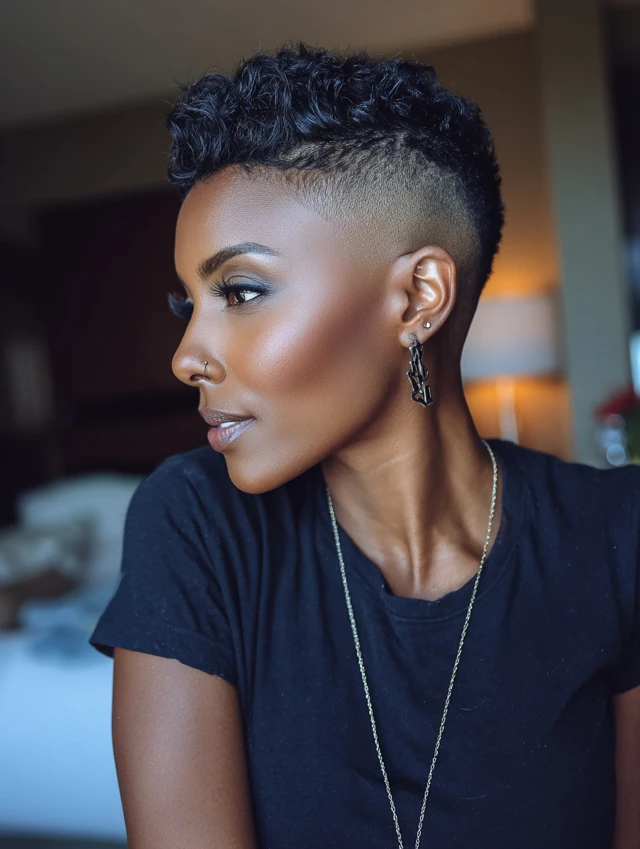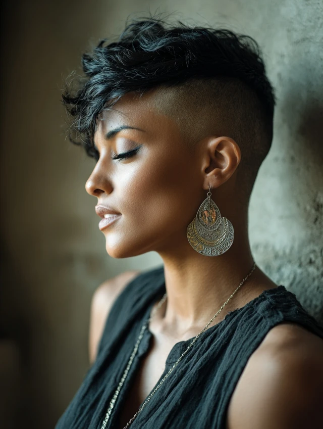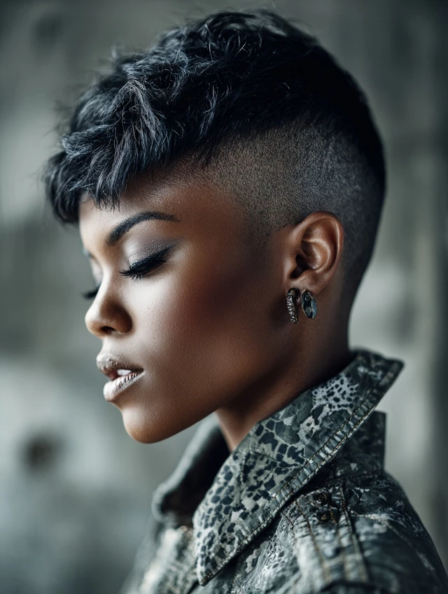 An undercut pixie adds bold contrast. It suits oval and long faces because the shaved sections sharpen the silhouette.
