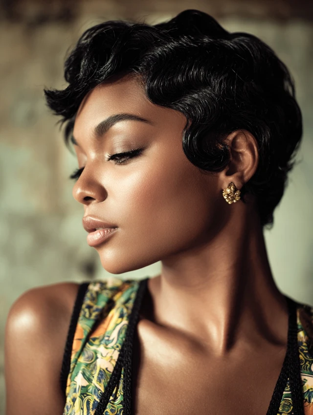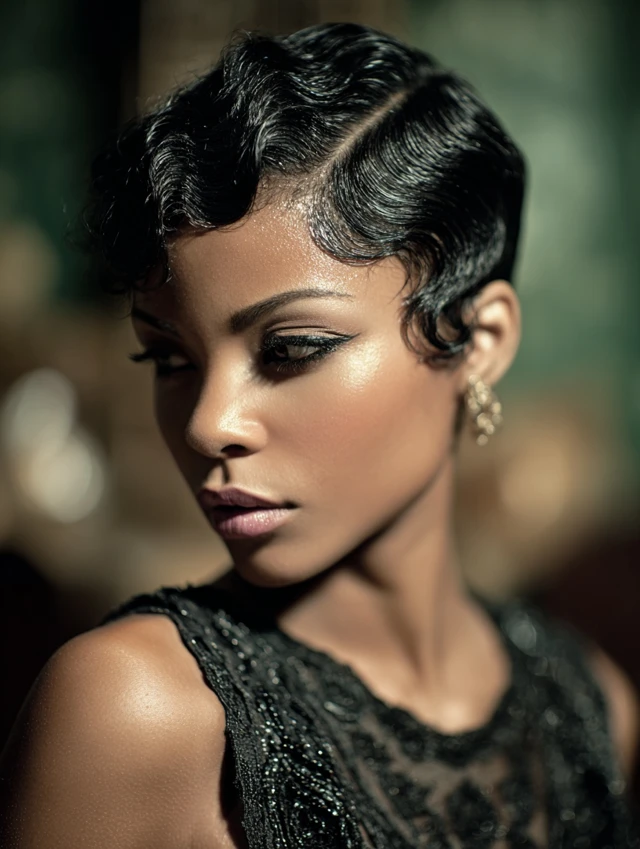 Finger waves add vintage glamour. This style suits angular and petite faces. The sculpted waves create dramatic detail.