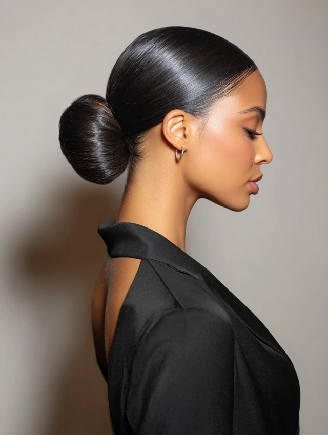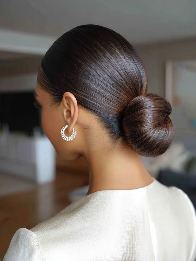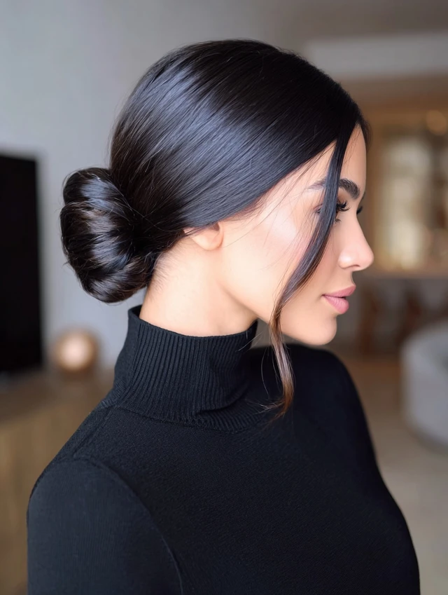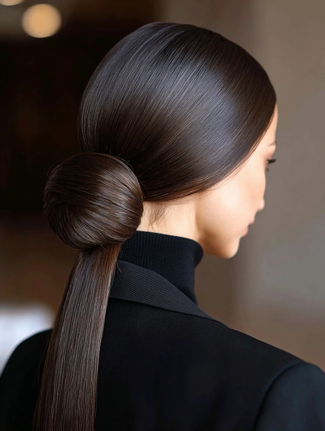The low sleek bun keeps ends tucked and protected near the nape. This style flatters oval, heart, and square face shapes because it highlights cheekbones and jawlines cleanly. Fine and medium-density straight hair holds this look especially well with minimal product.