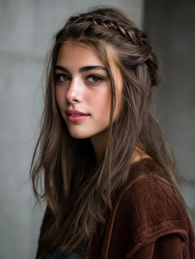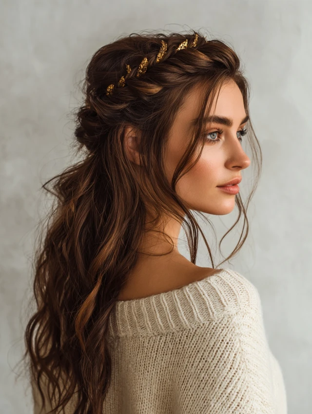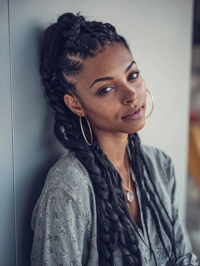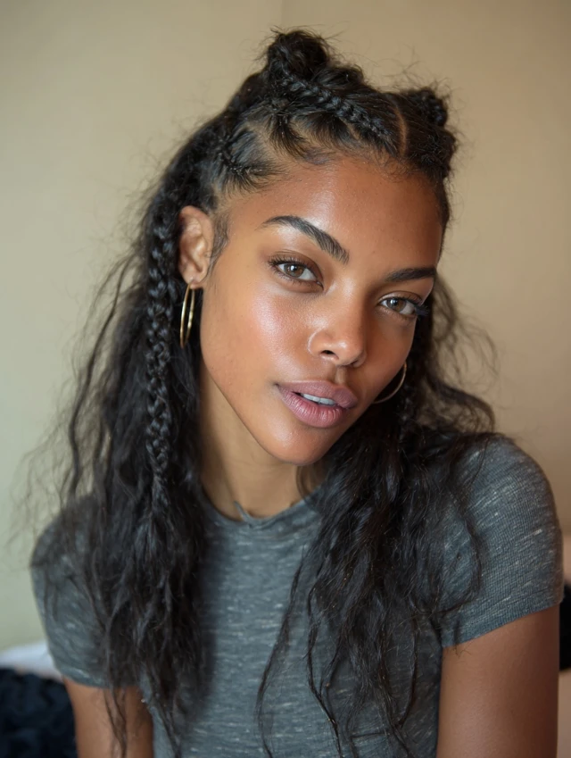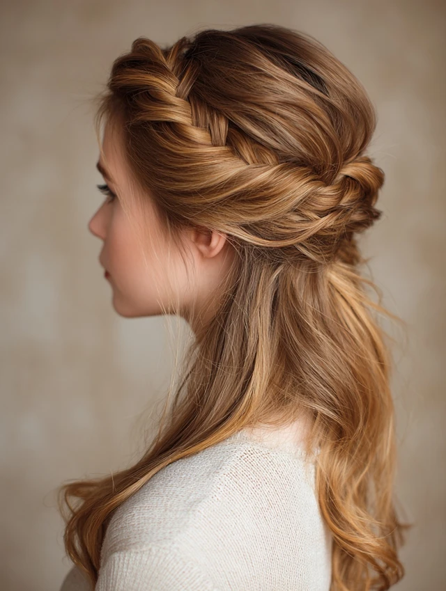 The half-up braided style protects the top section while leaving lower layers loose. It suits square and round faces because it adds height and structure. Straight hair holds braids neatly, which keeps the look clean.