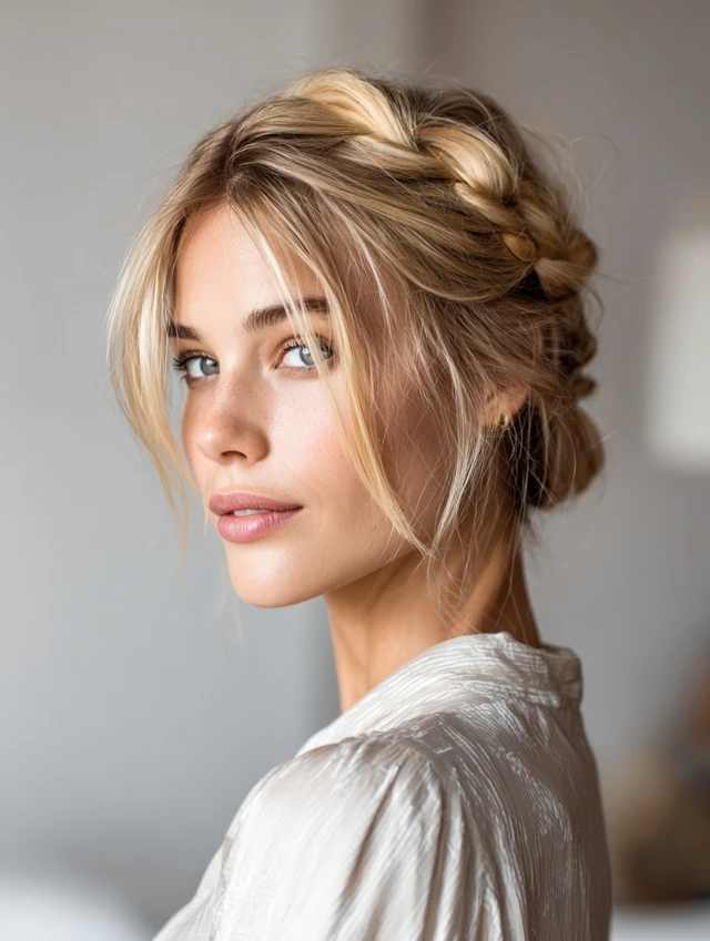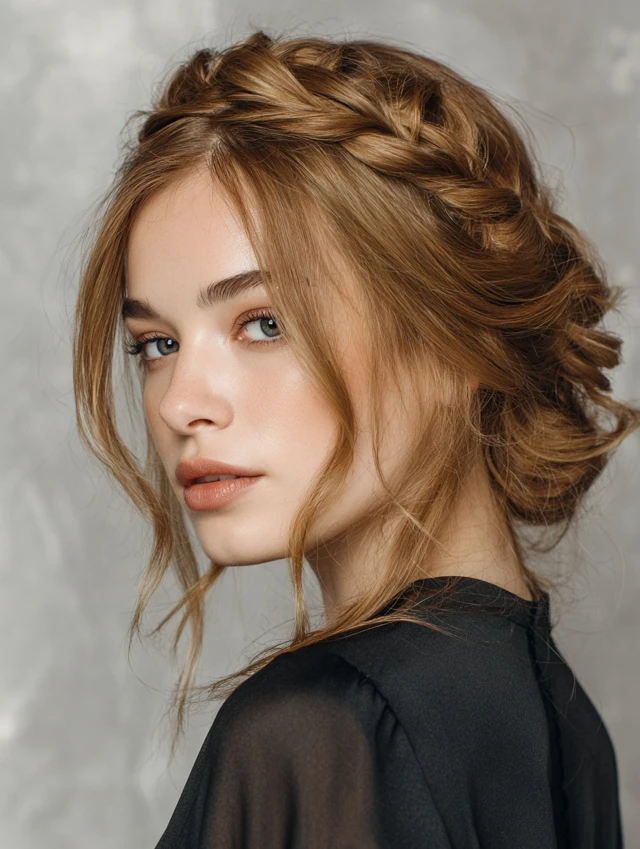 The twisted crown wraps sections around the head and keeps ends hidden. It flatters heart and oval face shapes by framing the forehead softly. Fine straight hair gains dimension with this style because the twists add subtle texture.