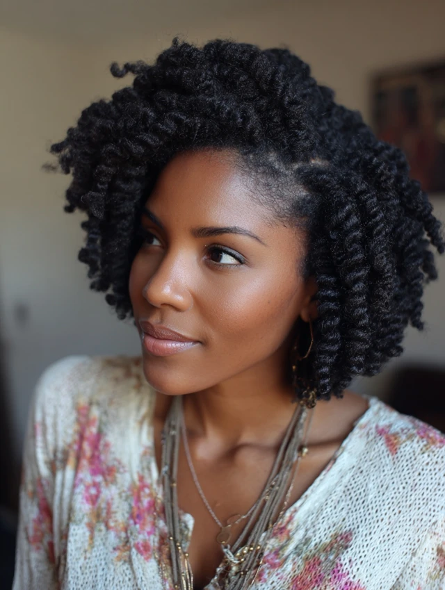 A bob-length twist style sits around the chin or collarbone. It suits oval and heart-shaped faces because it frames the jawline softly. The shorter cut prevents heaviness.