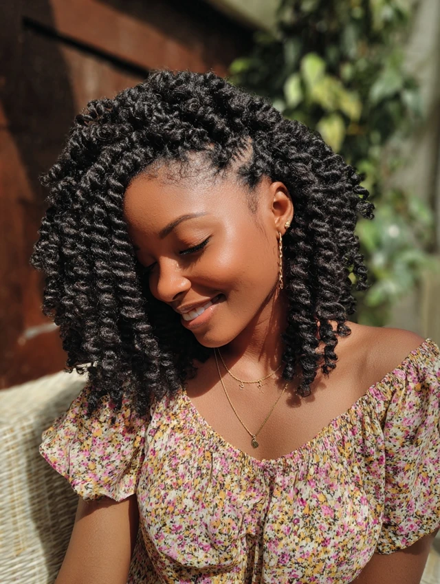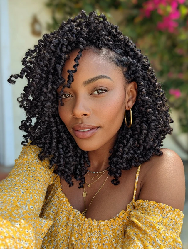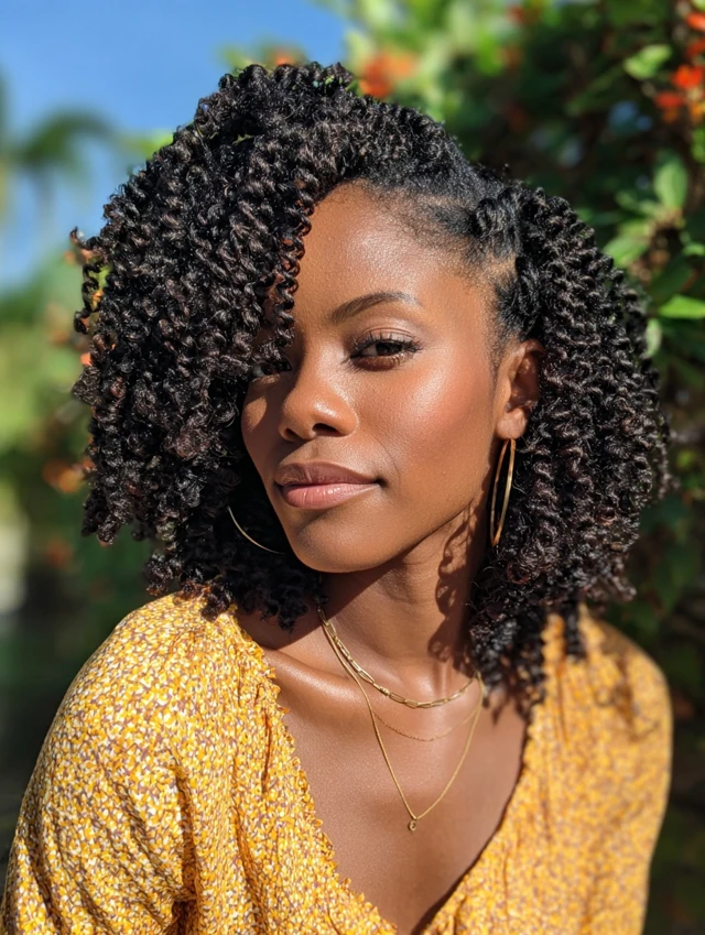 Short crochet twist hairstyles combine protection and flexibility. The shorter length reduces weight and strain. You still get fullness and style without the heaviness of long twists.