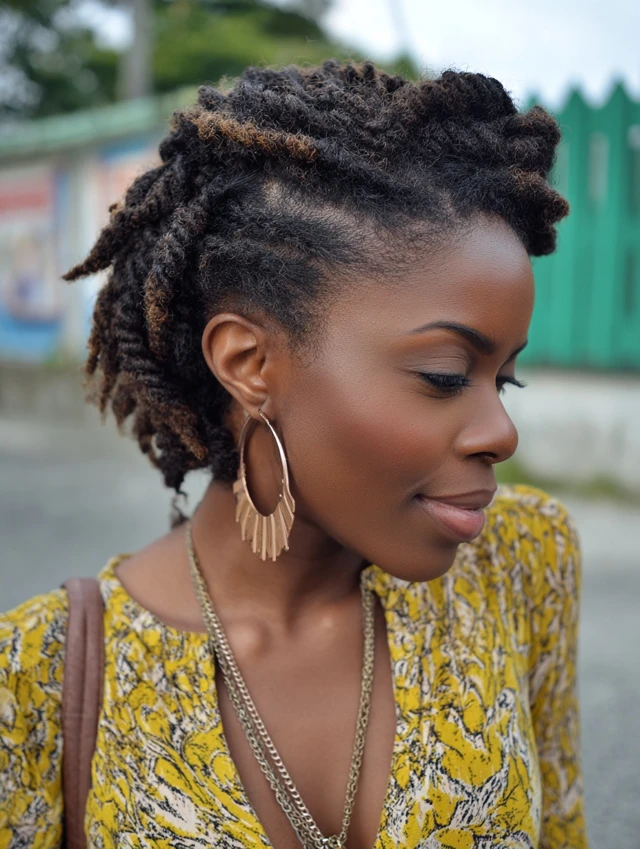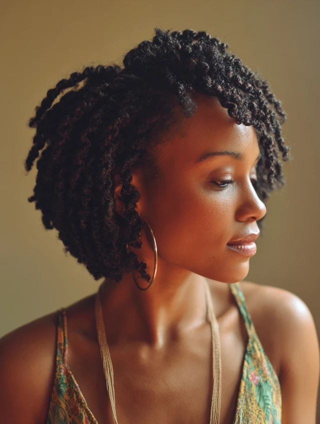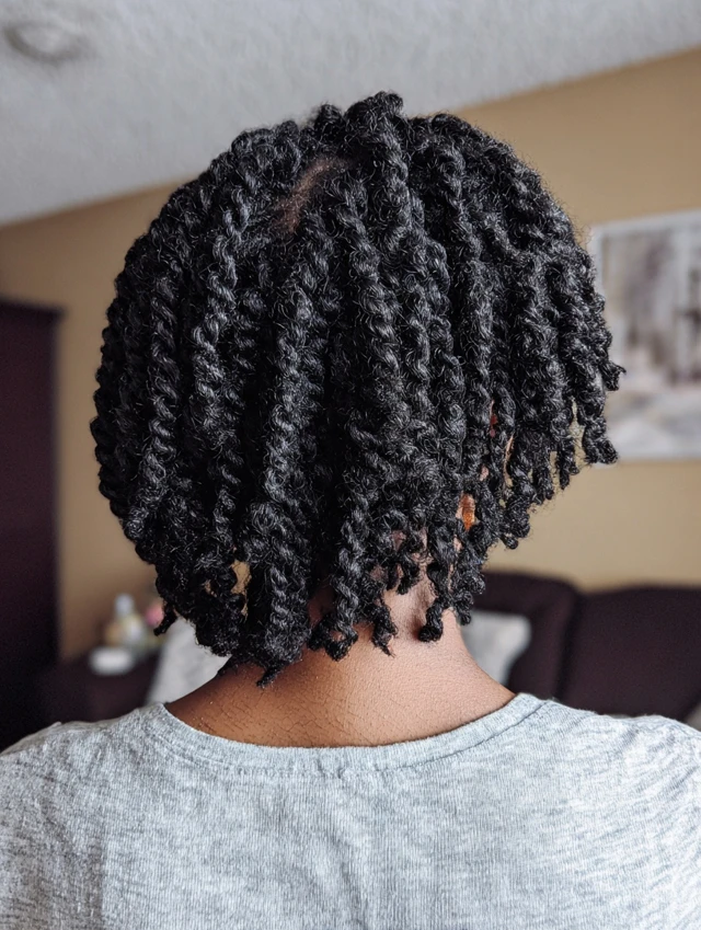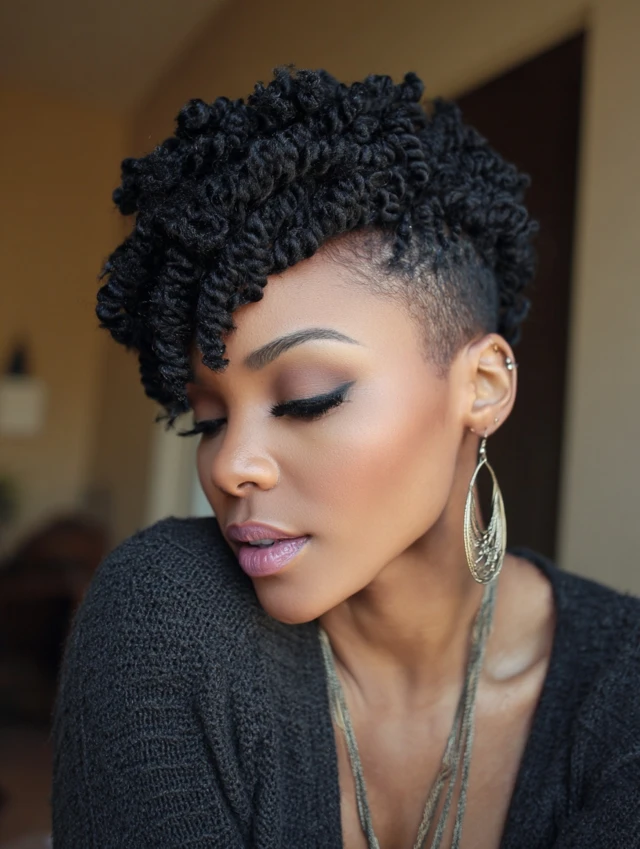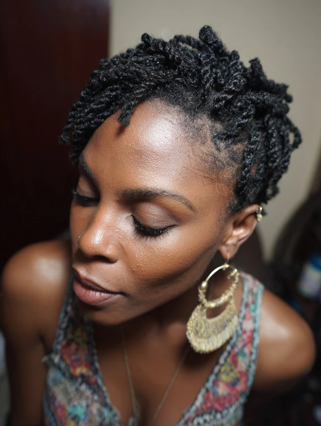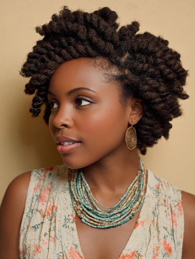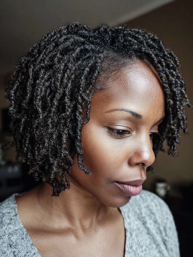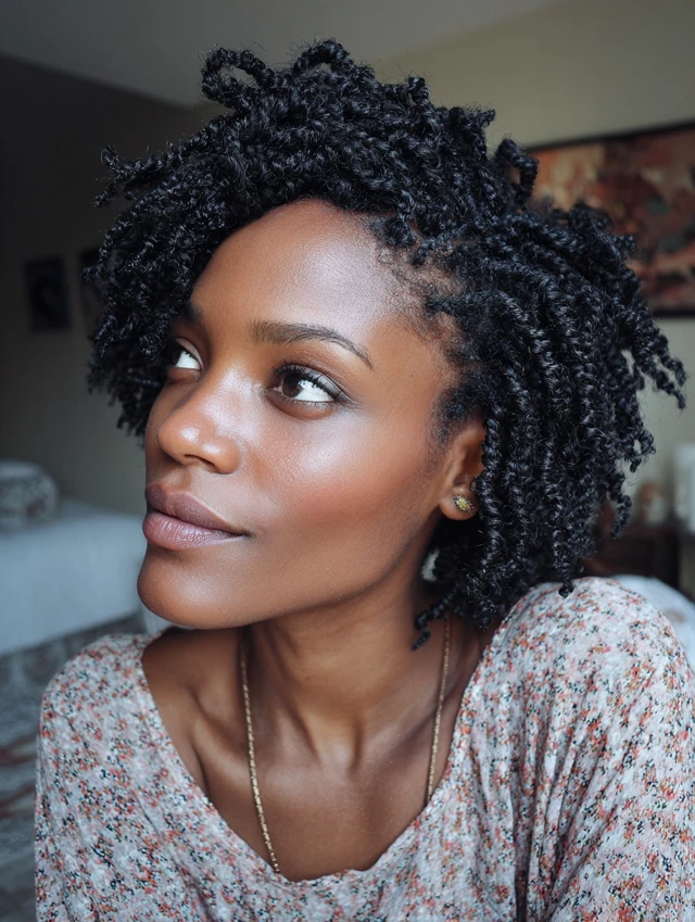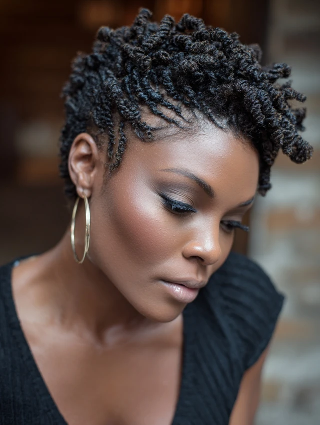 A pixie-length twist look feels bold and modern. It suits angular and petite faces because it highlights cheekbones. The shorter length reduces scalp tension.