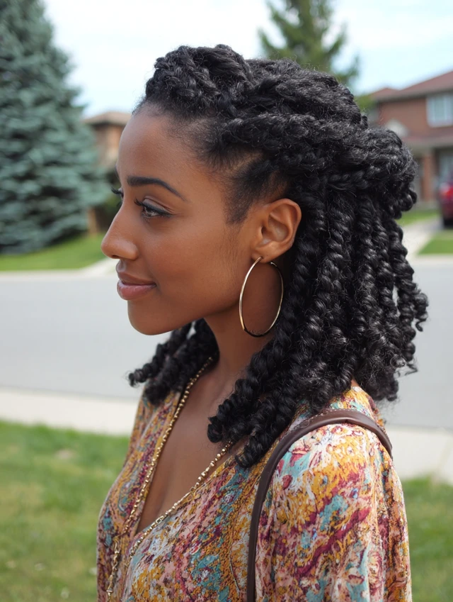 A half-up style gathers the top section for lift. It suits most face shapes because placement adjusts balance. The shorter twists prevent bulk at the crown.