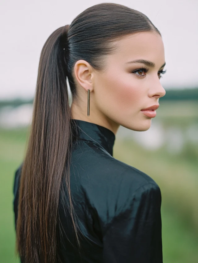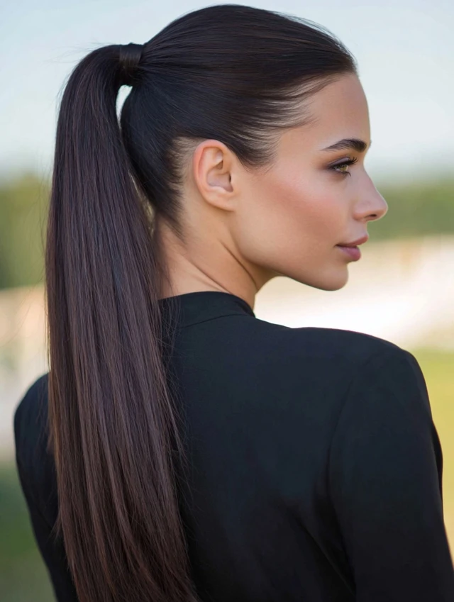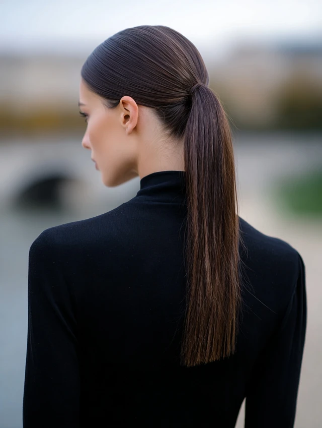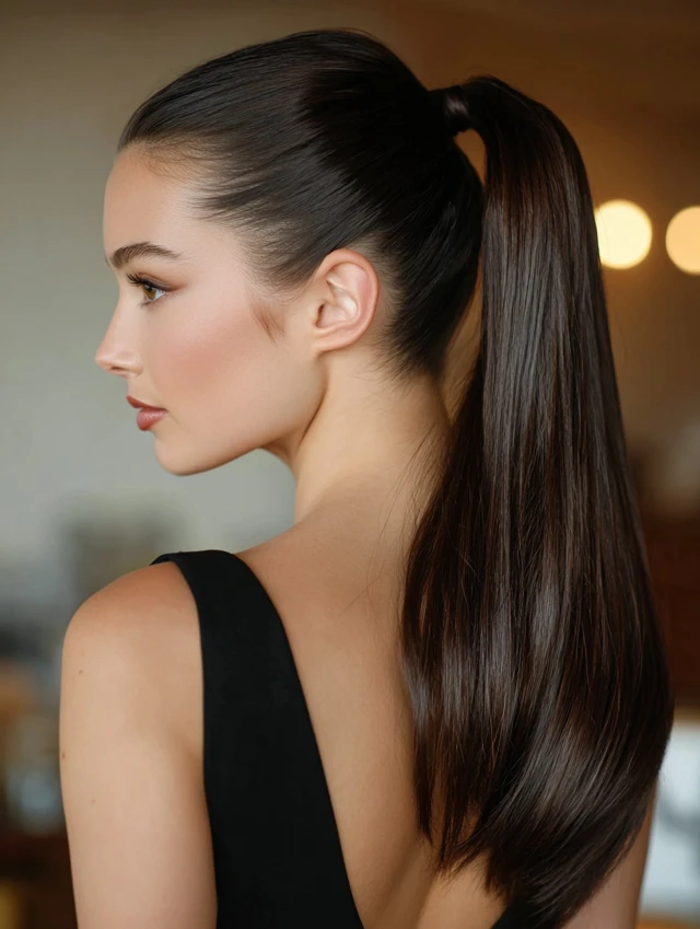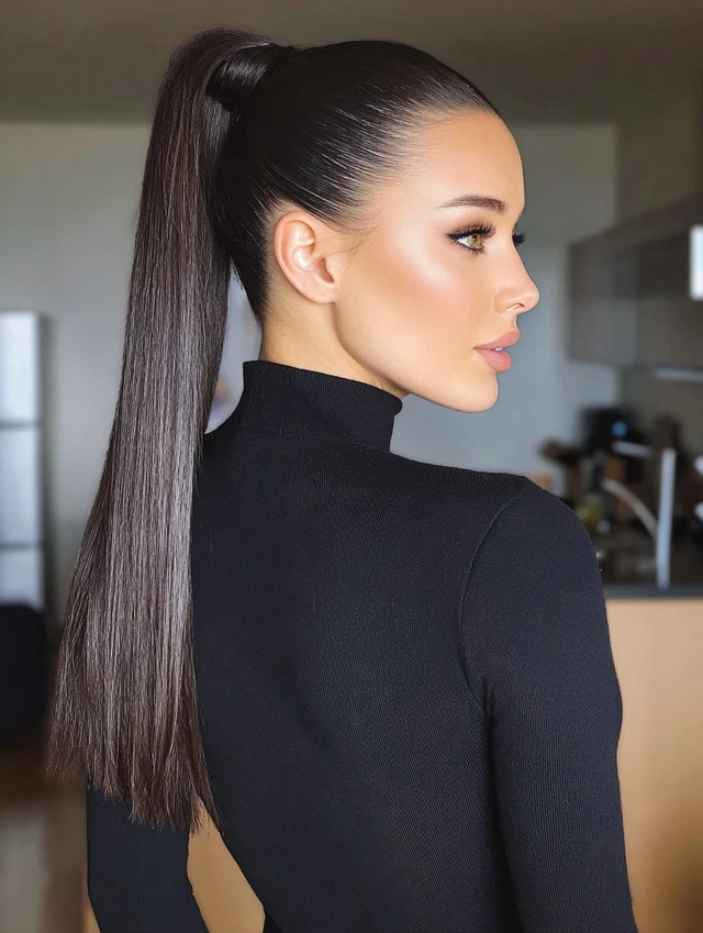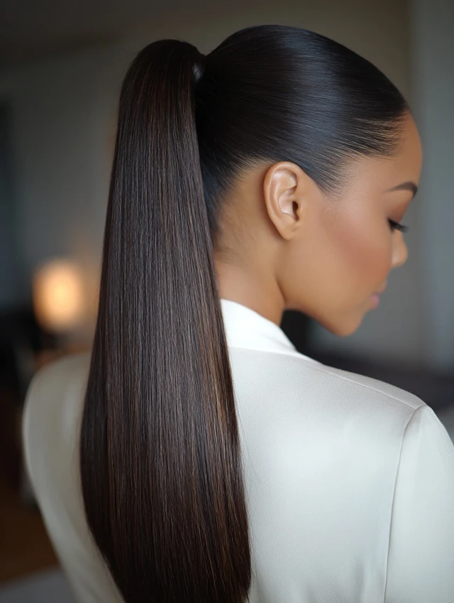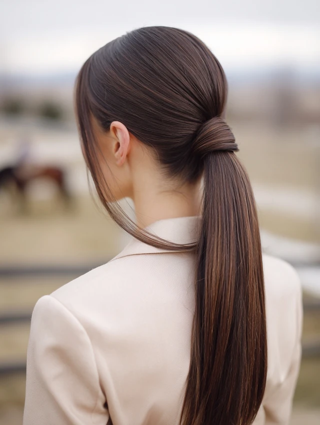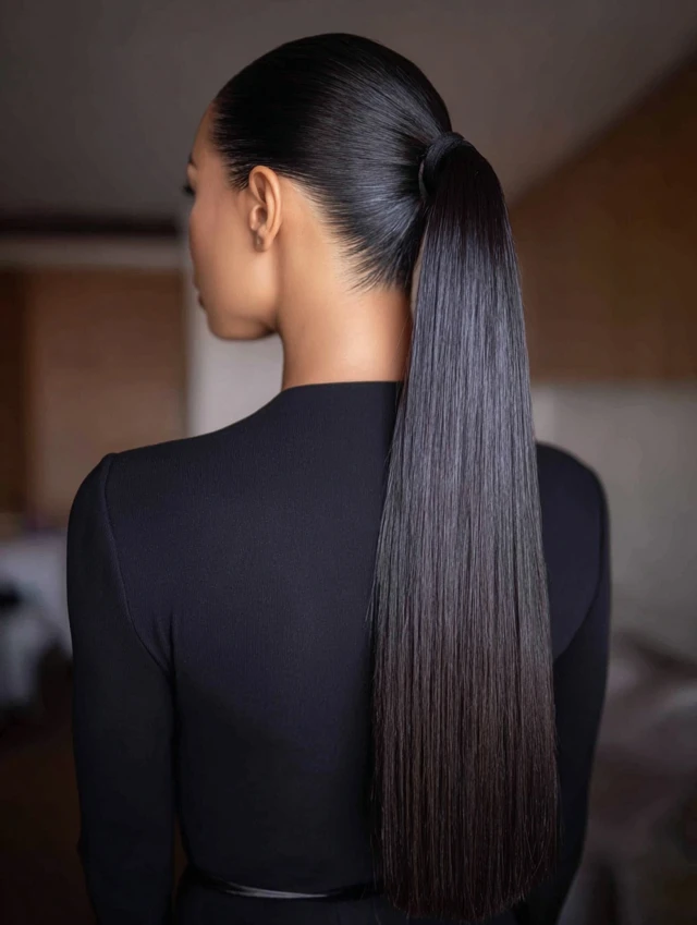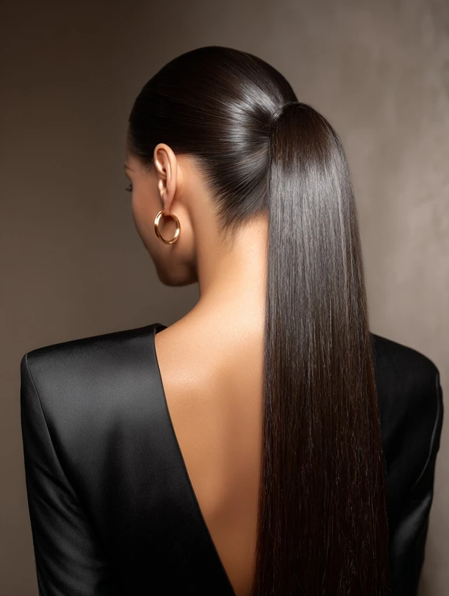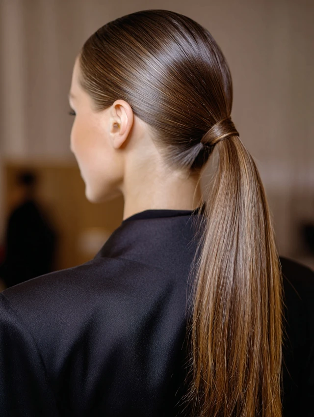Sleek ponytail hairstyles work because they create structure. The smooth surface reflects light and gives a neat, intentional finish. That contrast between tight roots and flowing length adds visual balance.