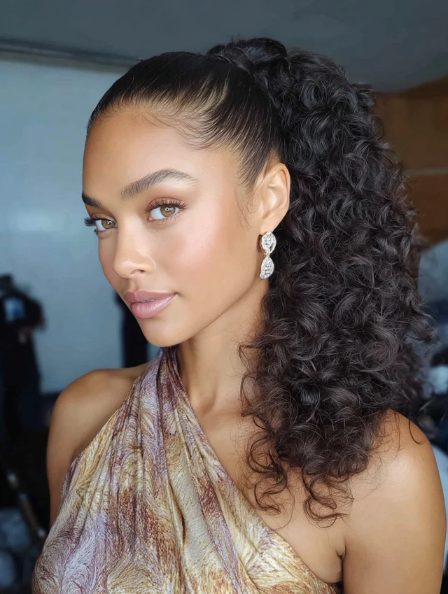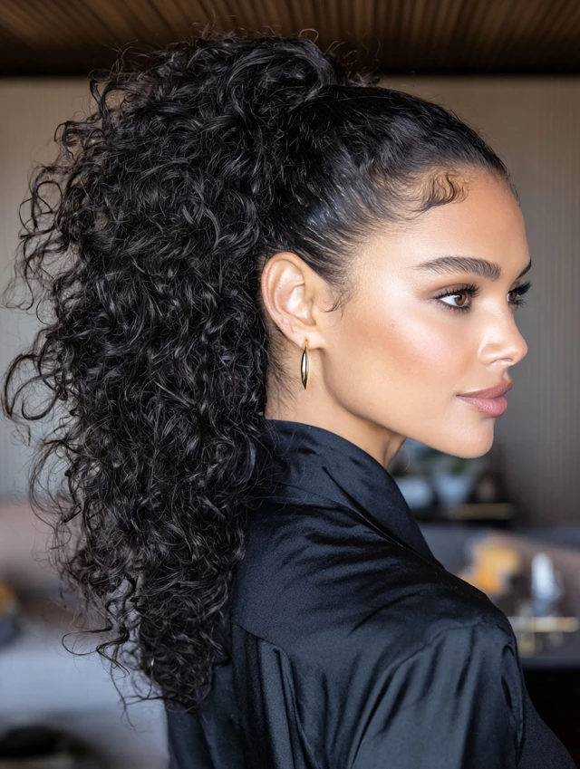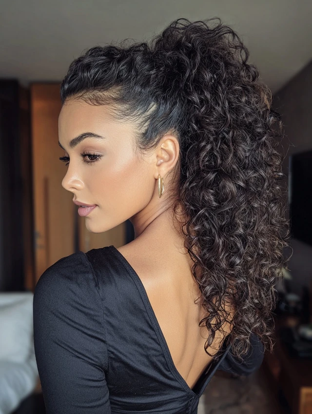 A sleek base paired with a curly ponytail creates contrast. The roots stay smooth while the ends add volume and movement. This works well for textured, natural, or heat-styled curls.