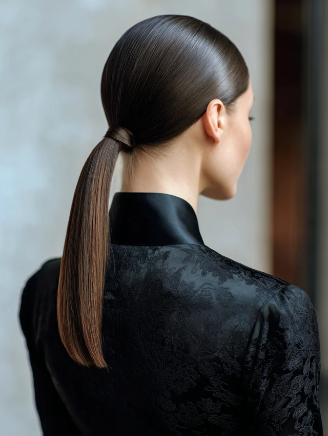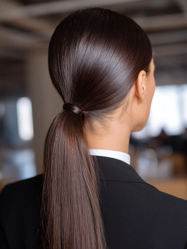A low sleek ponytail feels classic and sophisticated. It suits square and heart-shaped faces by softening strong angles. This placement works well on straight, wavy, or blow-dried textures.