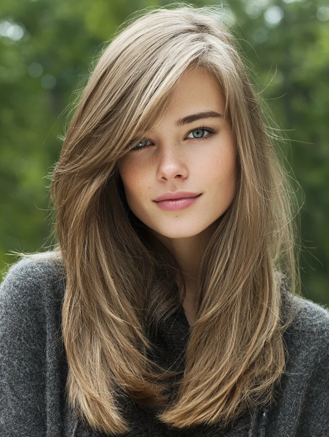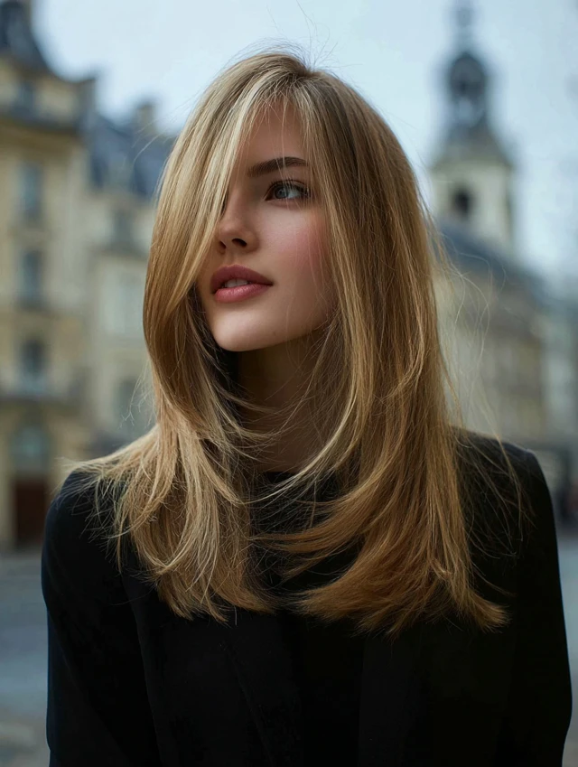 A deep side part adds drama and volume. Round faces benefit because the shift creates elongation. Straight layers enhance movement and prevent the style from looking flat.