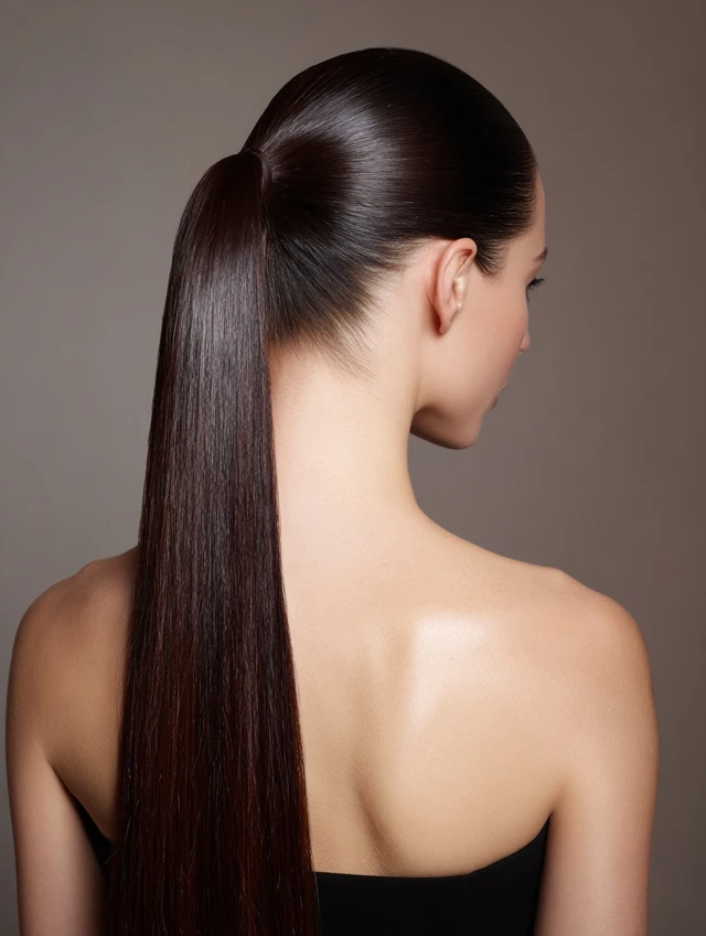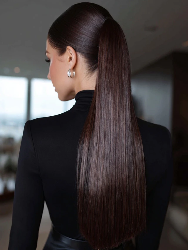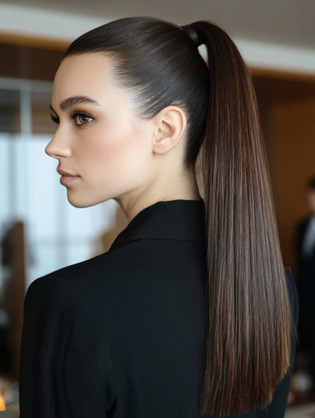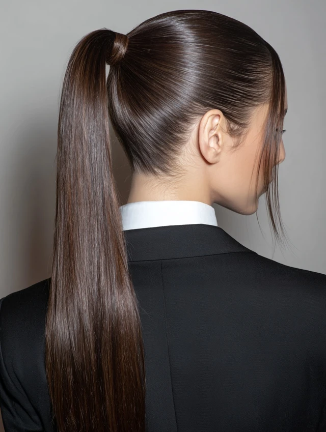 A high ponytail lifts the face and defines the profile. This style works well for oval and round faces. Straight hair creates a clean, sharp base.