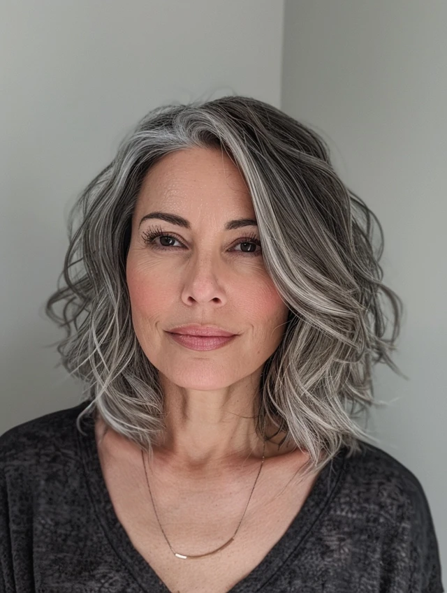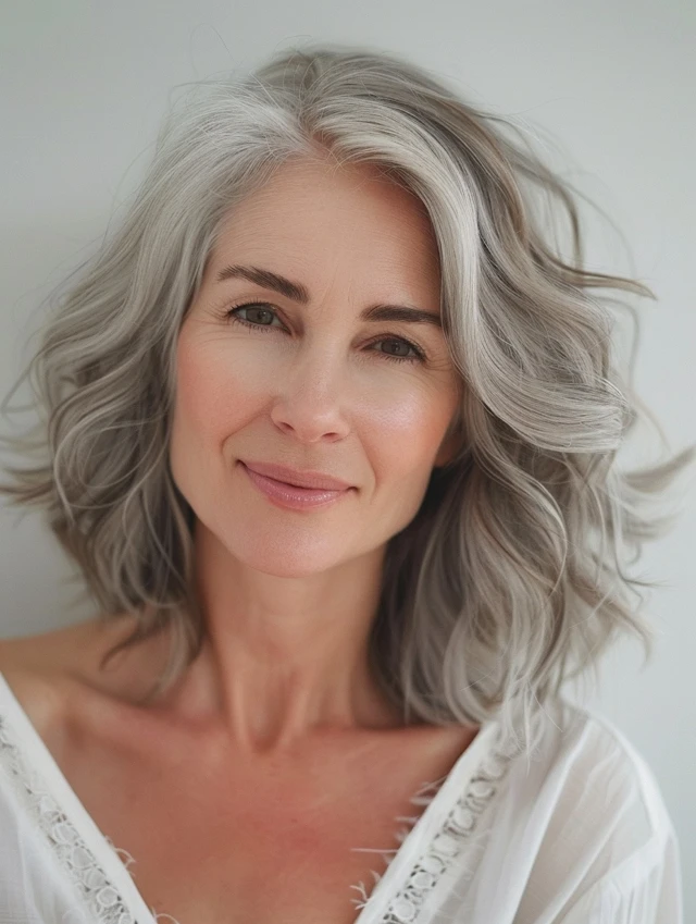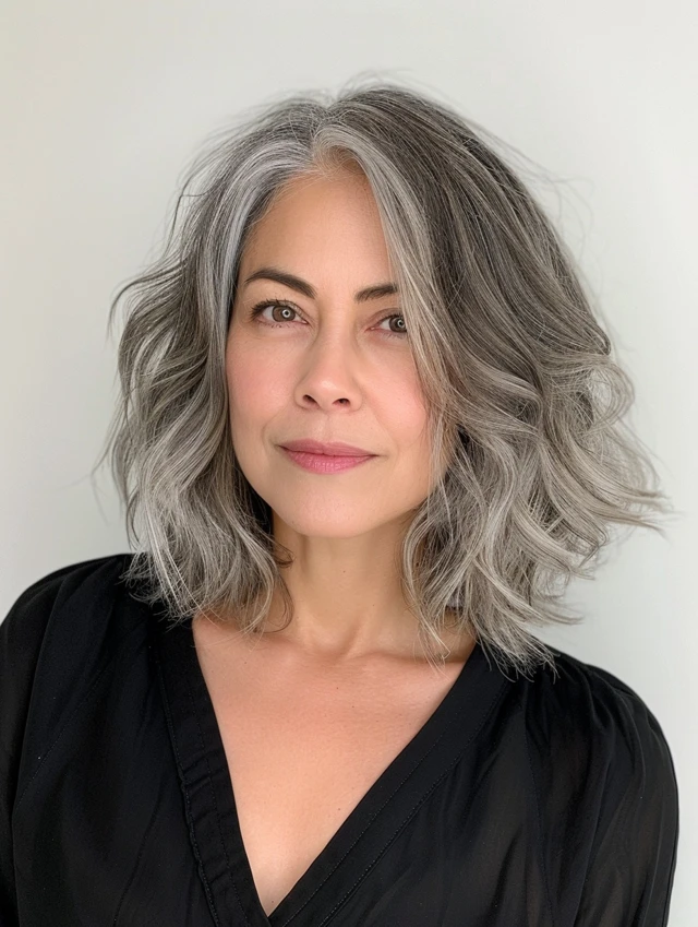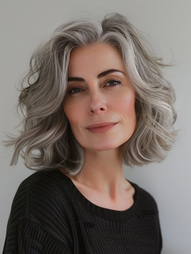 Textured wavy bobs are perfect for adding body to fine hair. Gentle waves create the appearance of fullness and make gray tones stand out. This style suits oval or heart-shaped faces, giving a relaxed yet stylish vibe.