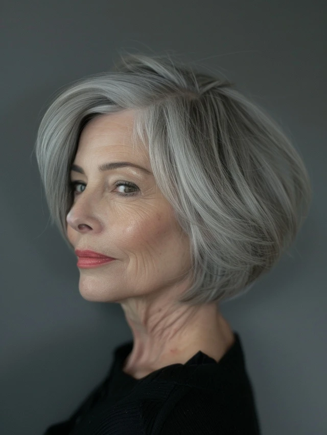 Stacked bobs have shorter layers in the back, gradually lengthening toward the front. This creates lift and volume at the crown, ideal for fine hair. Oval and round faces benefit most, as it elongates the face while highlighting natural gray tones.