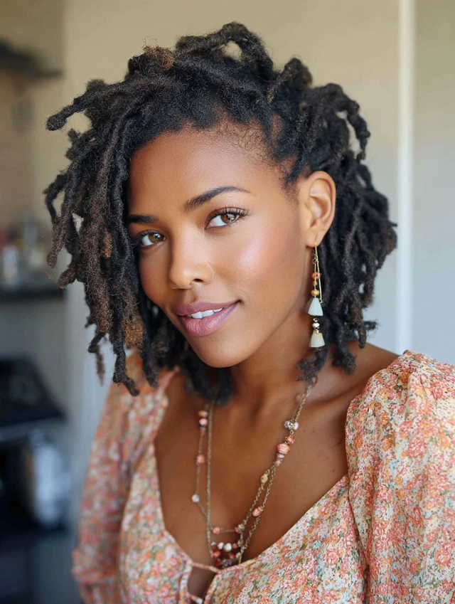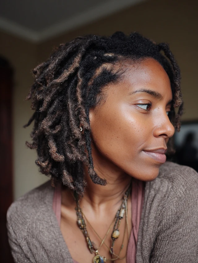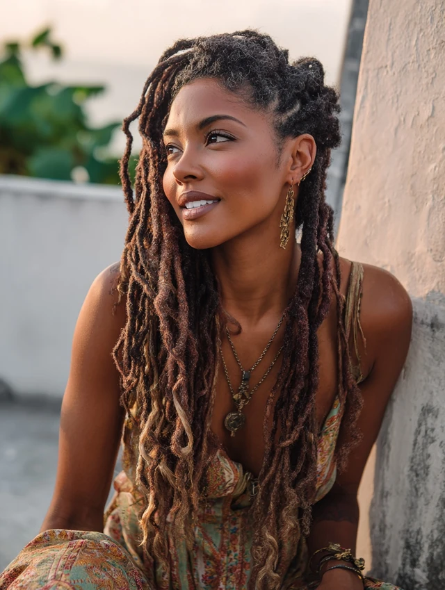 Adding layers to thin locs creates movement and shape. This style suits oval and heart-shaped faces because it frames features softly. The layered effect prevents a flat silhouette.