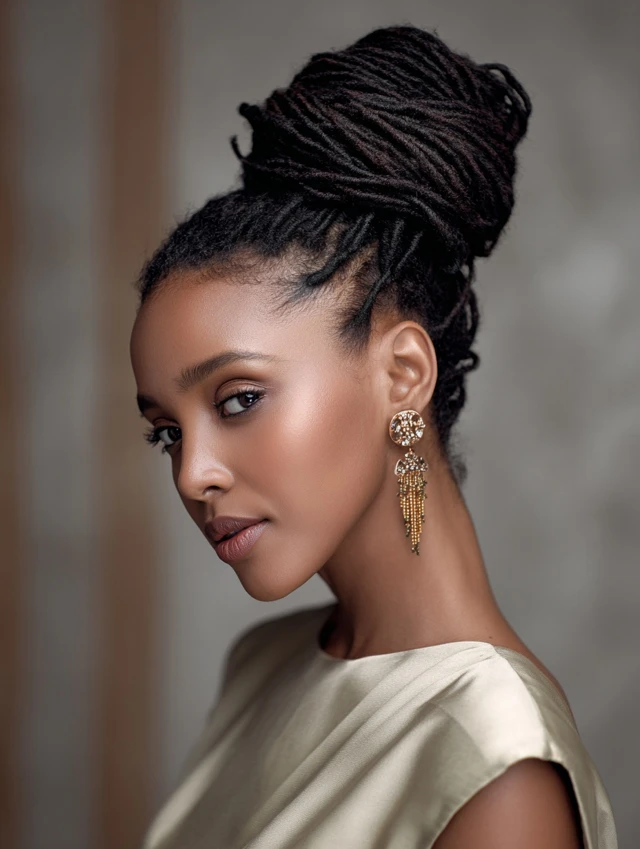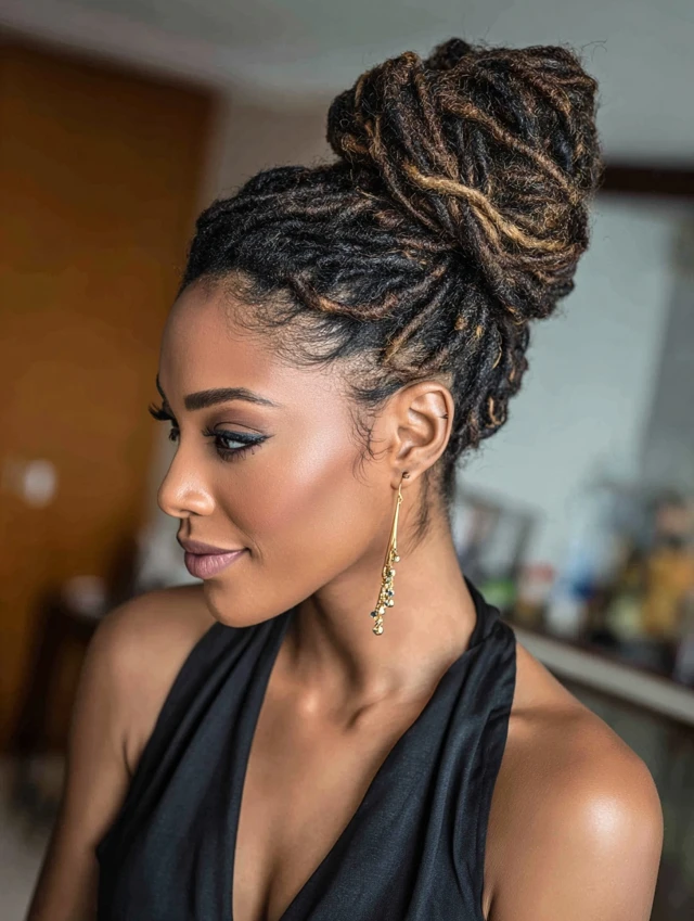 A high bun creates a clean, polished shape. It suits oval and heart-shaped faces by elongating the neckline. Thin locs wrap smoothly without bulky stacking.